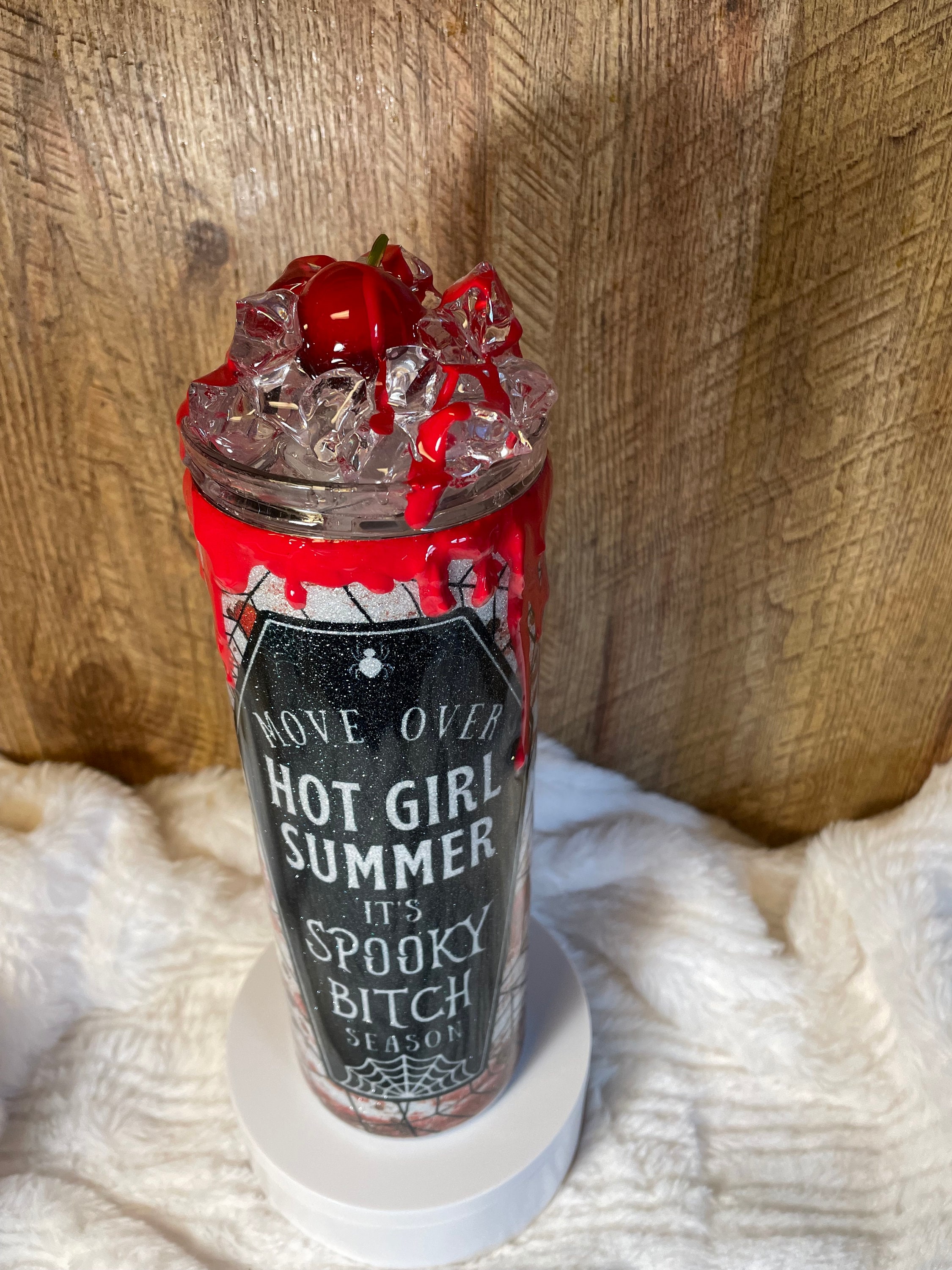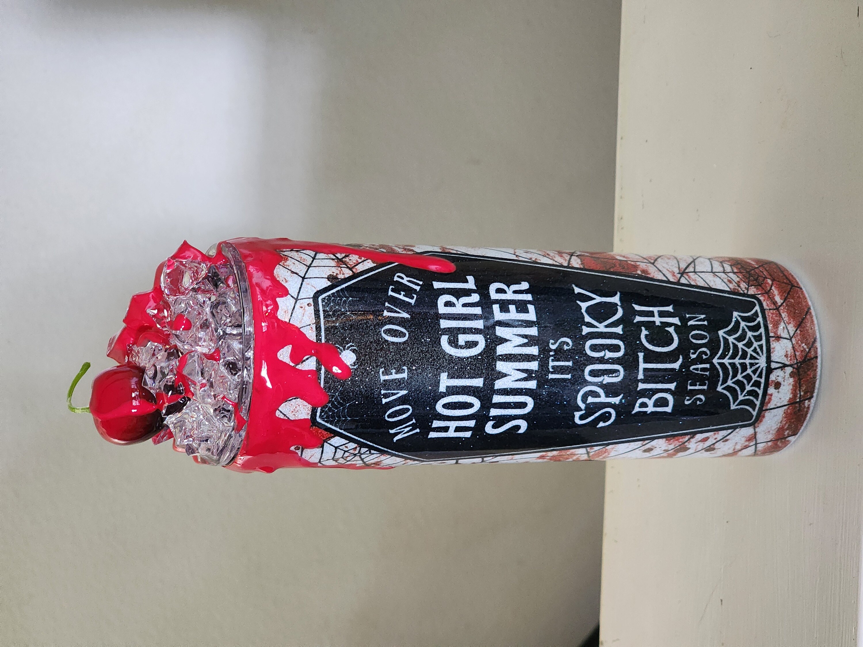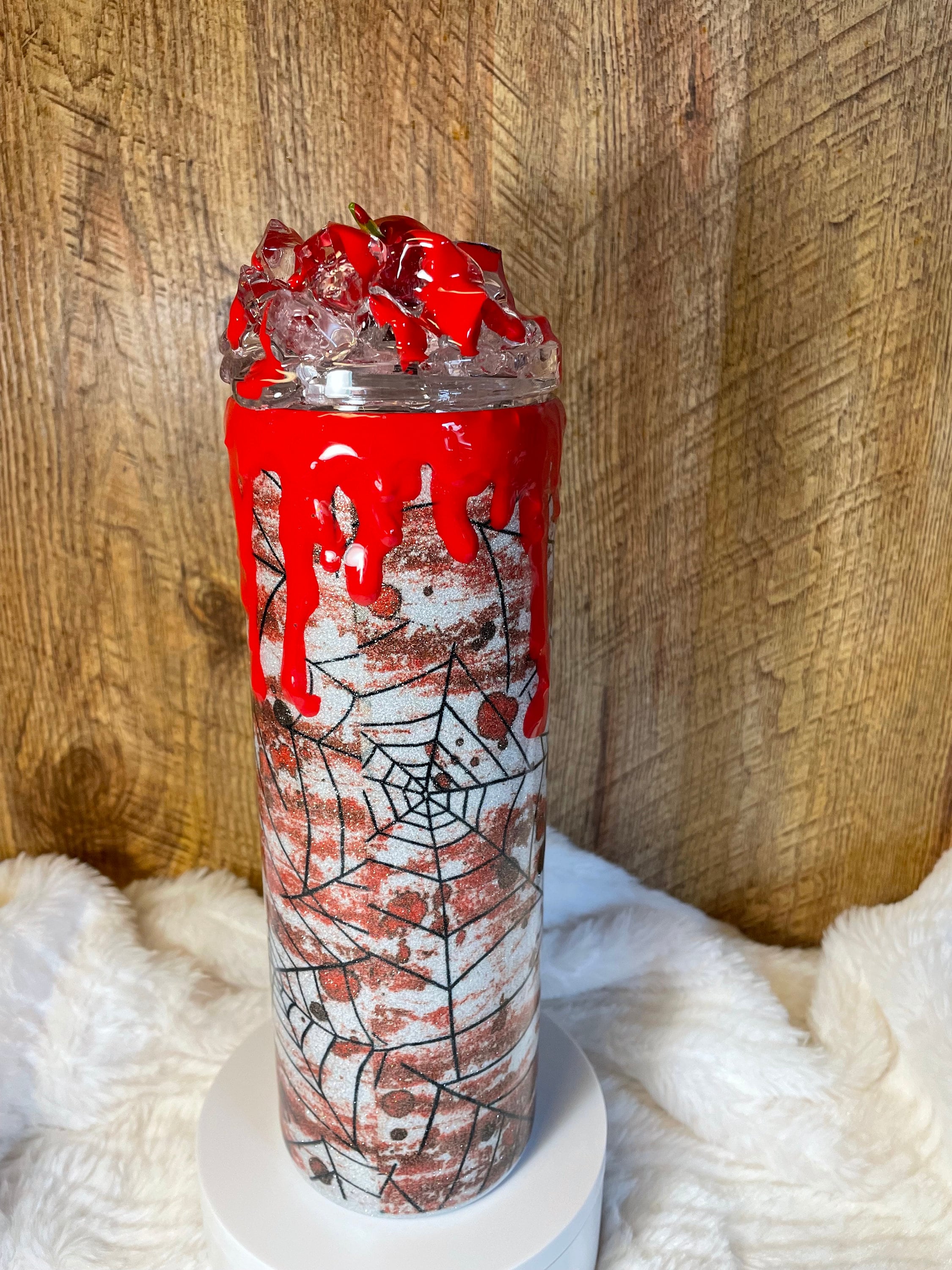 Epoxy glitter tumbler with 3D faux blood spatter. One of a kind 3D lid featuring “ice” and red cherry with faux blood spatter. add free personalization for additional processing time.