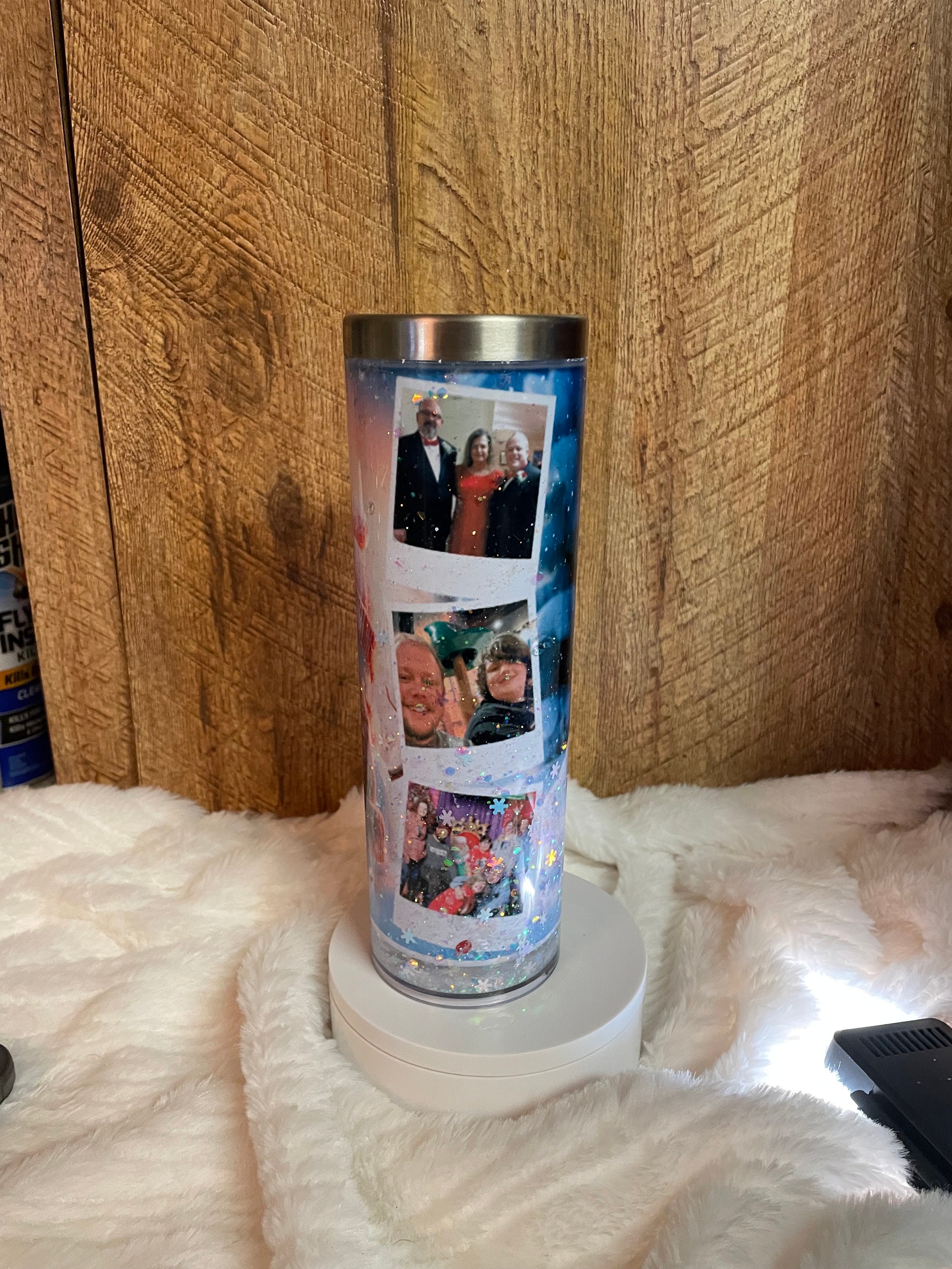 Stainless steel and acrylic double wall tumbler with three photos of your choice! Name can be added to back free.
