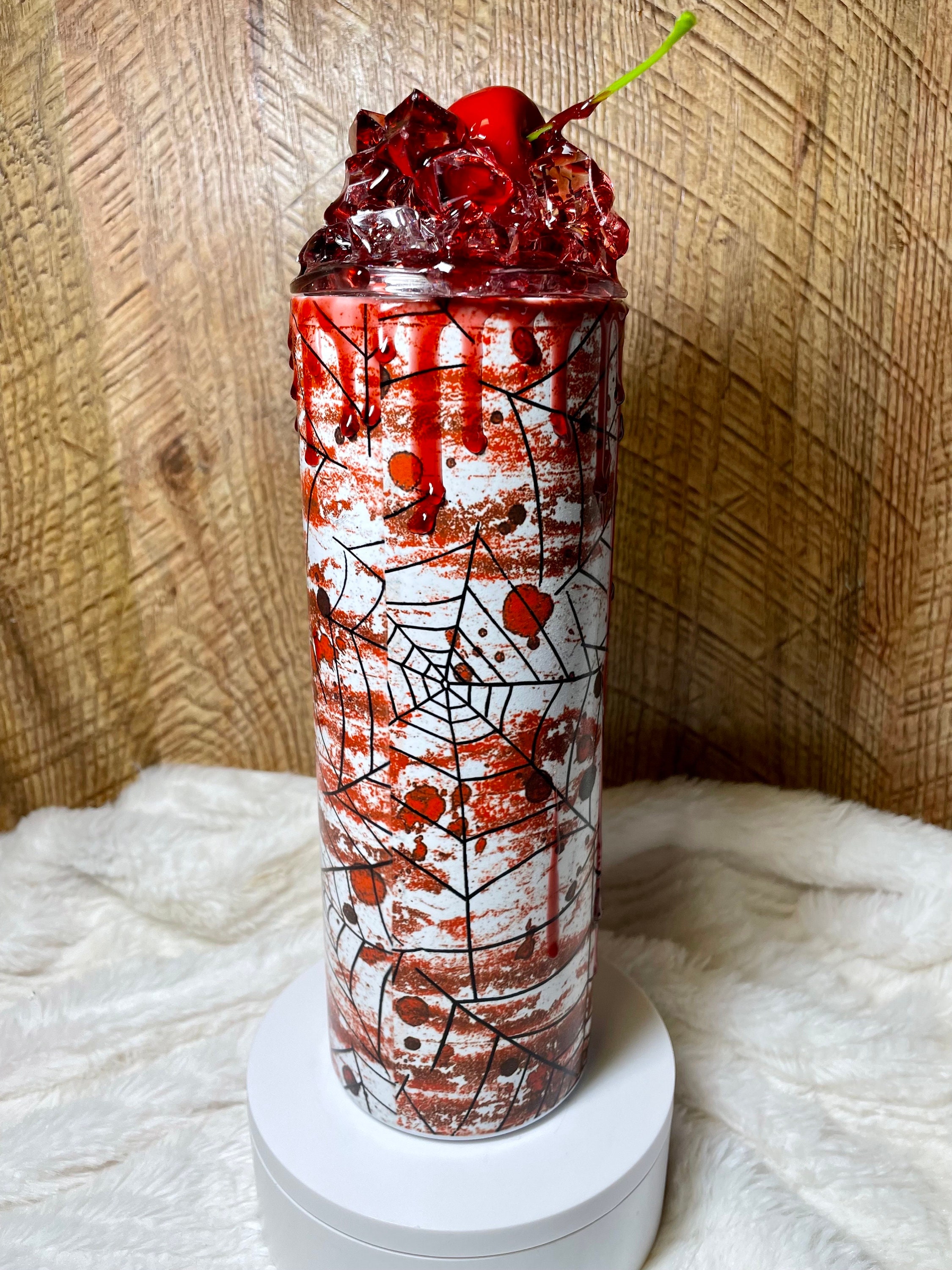 This is one of my personal favorite tumblers to make, it’s stunning. 3D faux blood spatter stainless steel tumbler keeps drinks hot or cold for hours. Each tumbler is hand made so no two will be exactly alike. 3D lid featuring “ice” and red cherry with faux blood drips. Ready to ship as is or add free personalization for additional processing time.