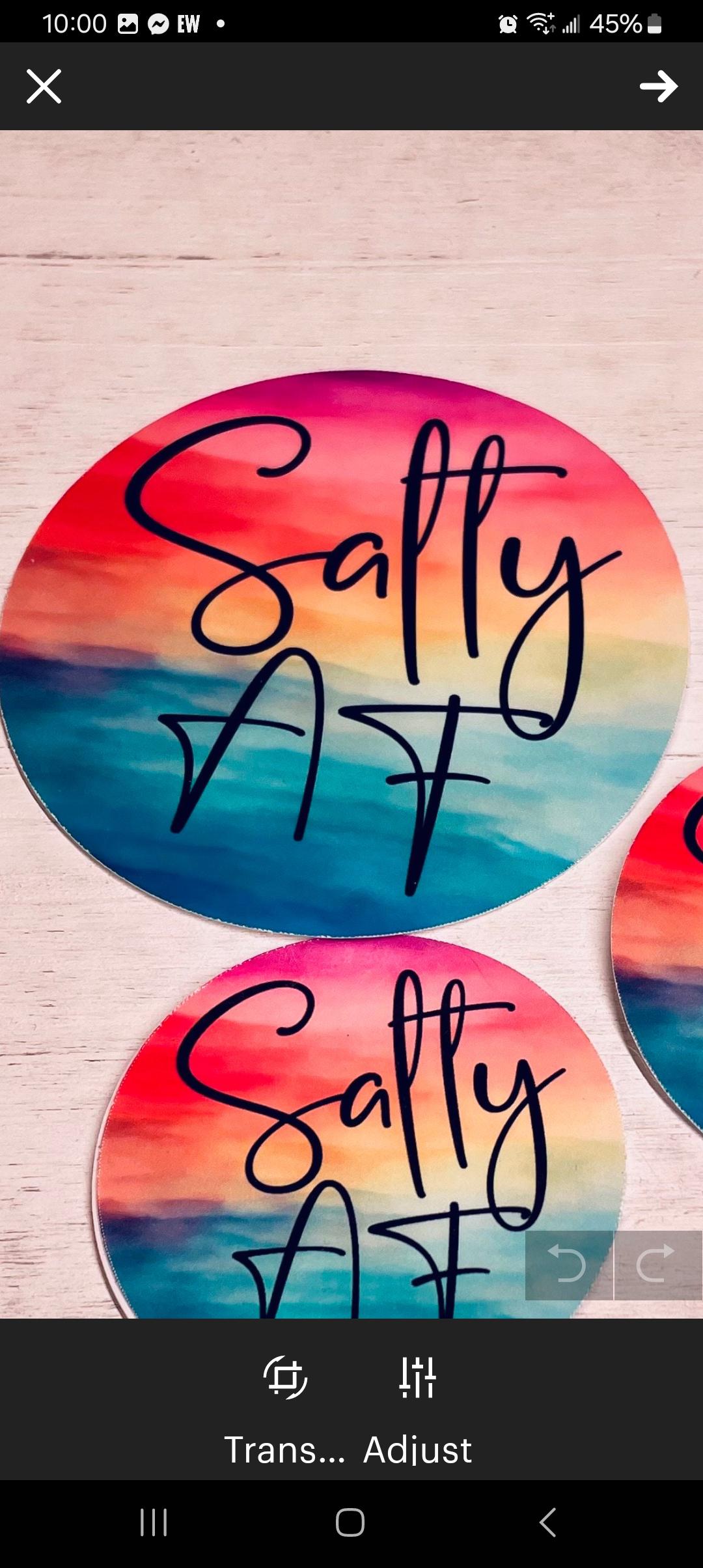 Salty AF premium vinyl decal sticker. Designed and made by me. Sunset vibes theme. This set includes 3 round stickers 3 inch, 2.5 inch, and 2 inch. If you love the design but need a different size or shape, reach out. Free shipping in stamped envelope between cardstock to protect. Reach out for any custom needs.