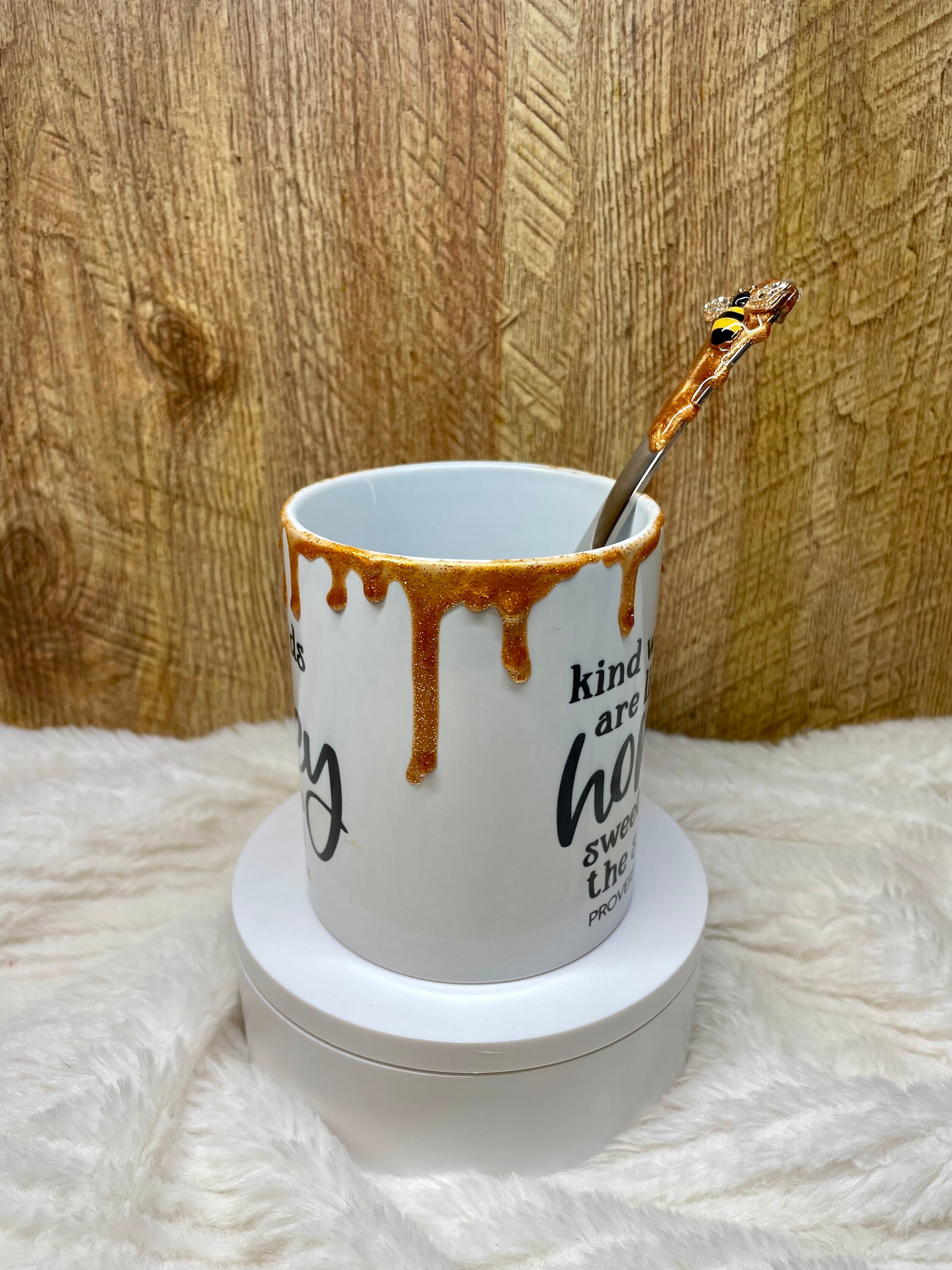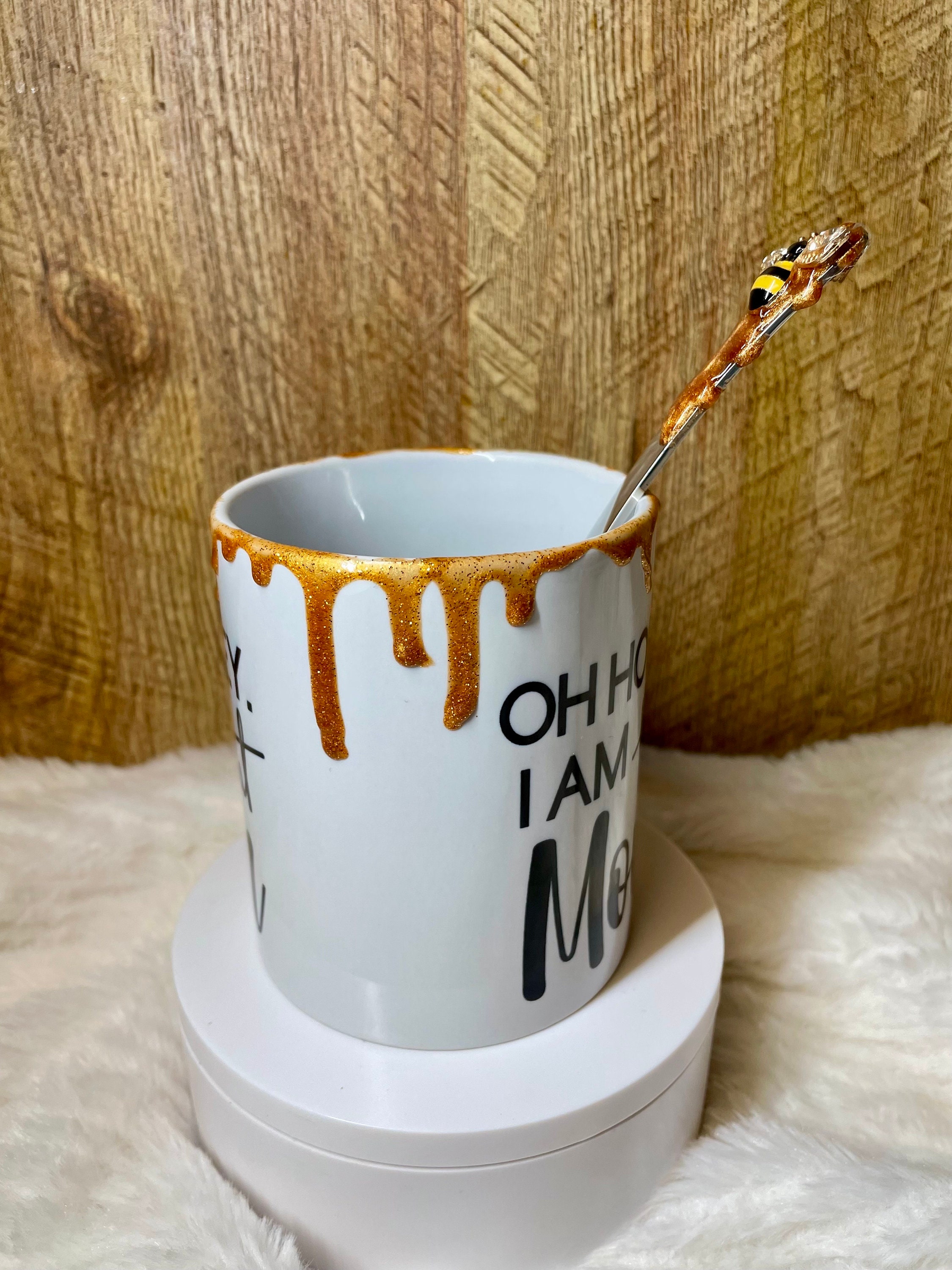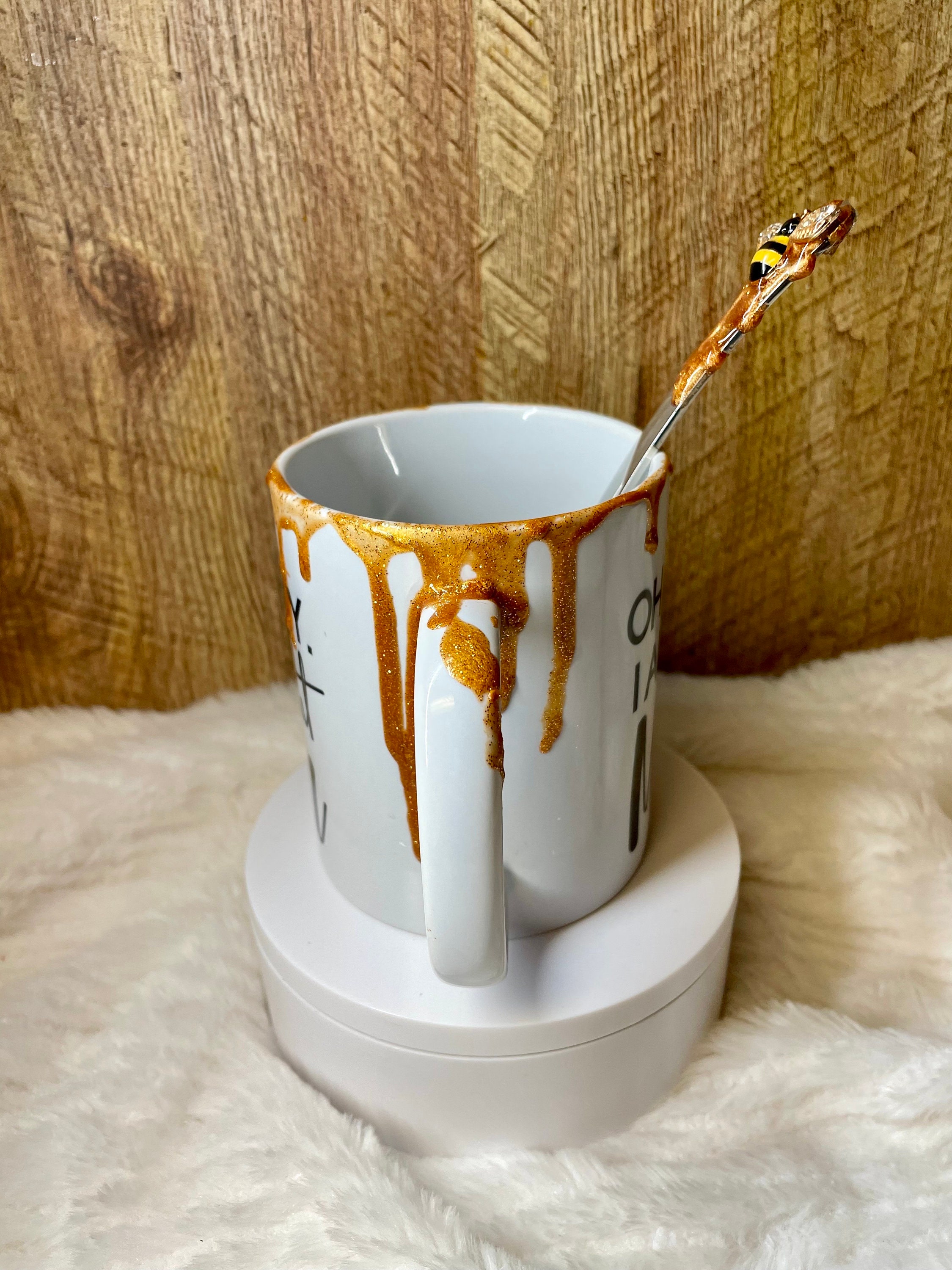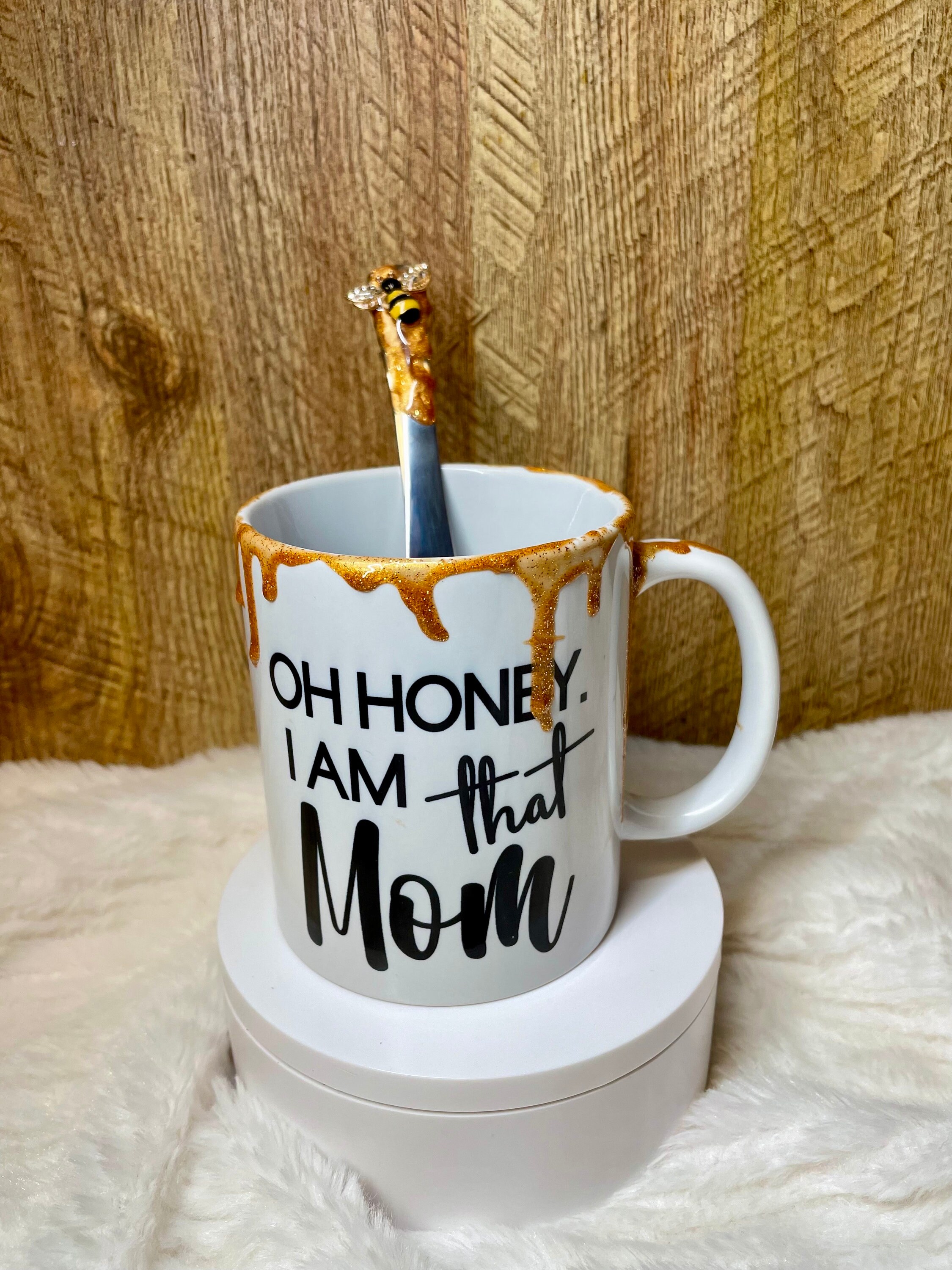 OH HONEY I am that Mom. Ceramic coffee mug and spoon set with beautiful glitter epoxy drip. Spoon has adorable honey bee. Makes a beautiful gift set for display, may also be used for everyday it’s made with food safe epoxy. Design is on both sides of mug for both left handed and right handed use. You may also choose to have design just on one side and a name or personalized quote on the other. Message me to make arrangements.