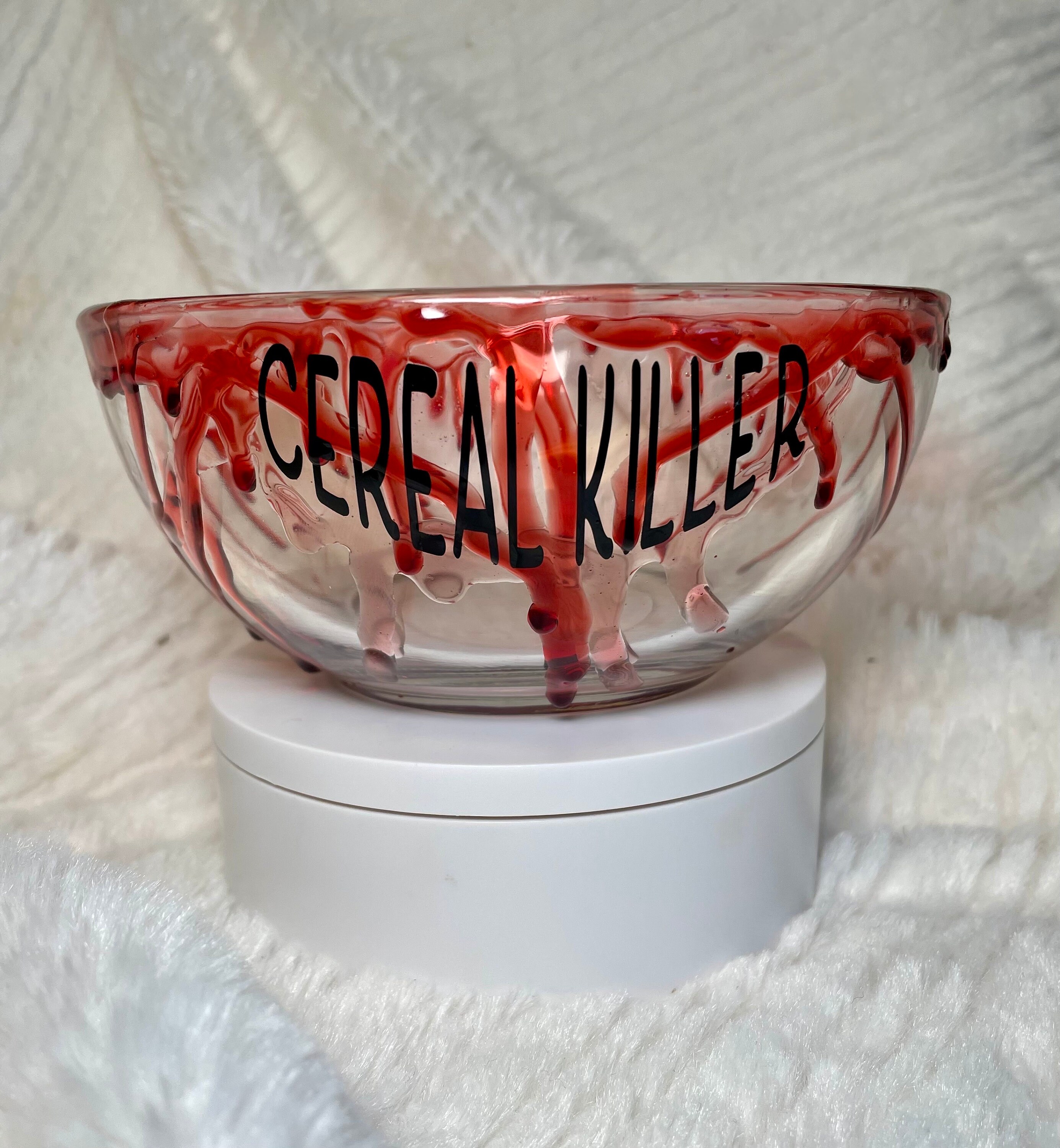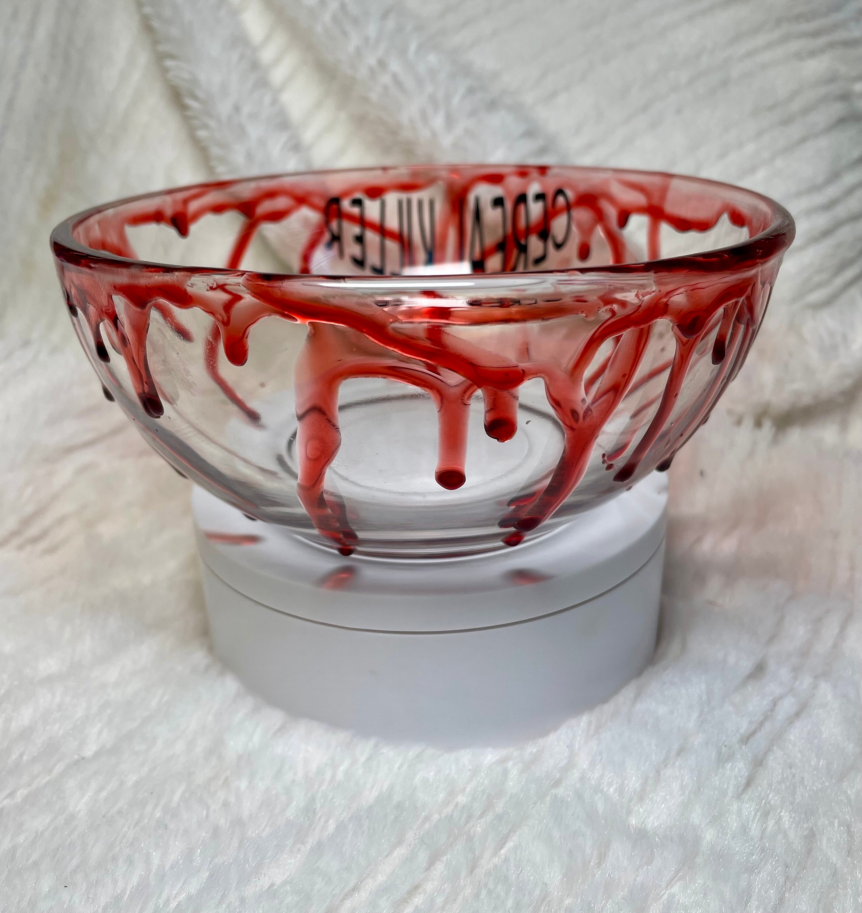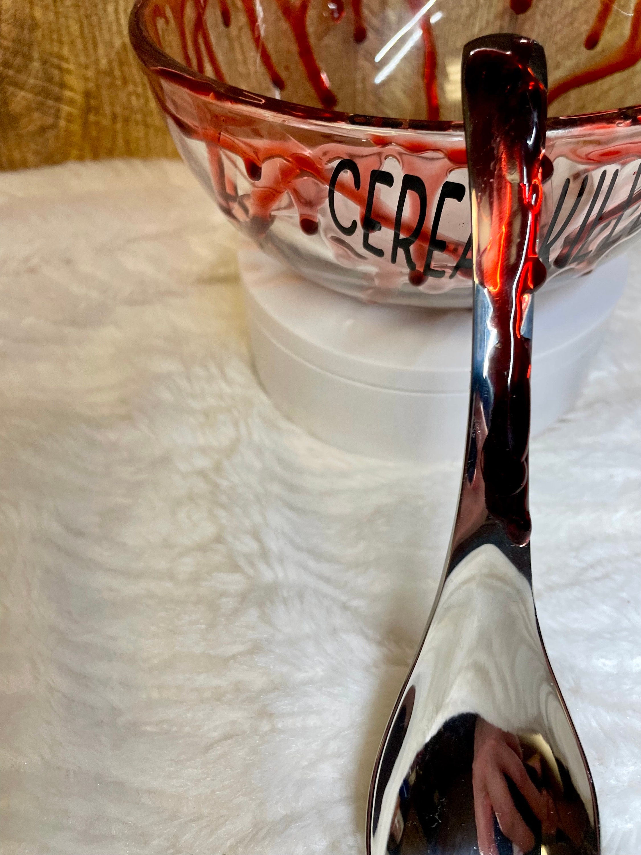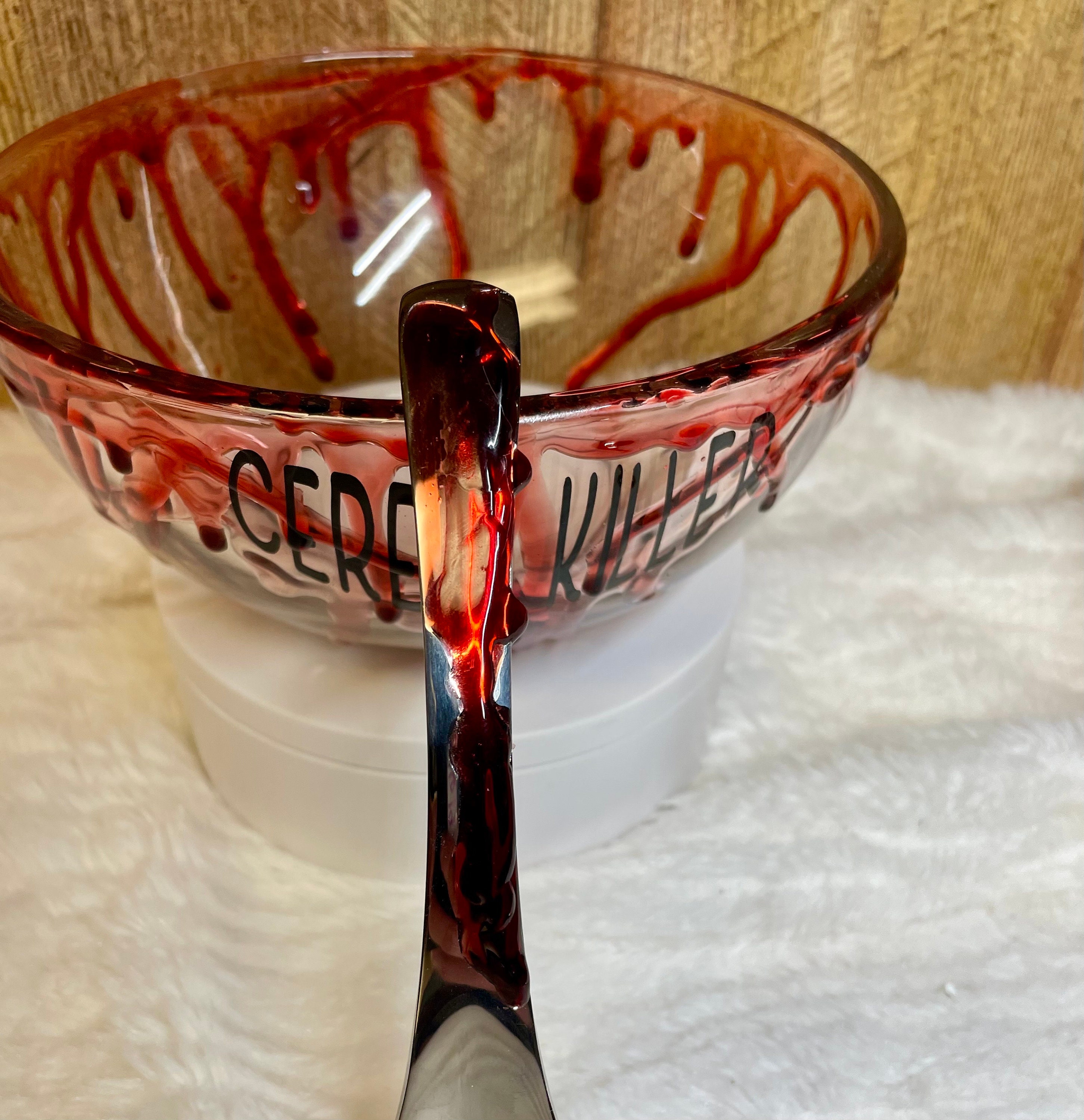 Cereal Killer 6 inch bloody glass bowl & spoon set, completely food safe! faux blood spatter on the outside of bowl. this bowl has got to be one of my favorite creations! it’s so fun, if you love true crime you’re going to love this bowl! Each bowl is hand made at the time of order, so no two will be identical however the spirit of the pictured bowl will be the same with blood spatter all around the bowl. Can be personalized if you like, reach out with any questions. If you need item sooner do not hesitate to reach out.