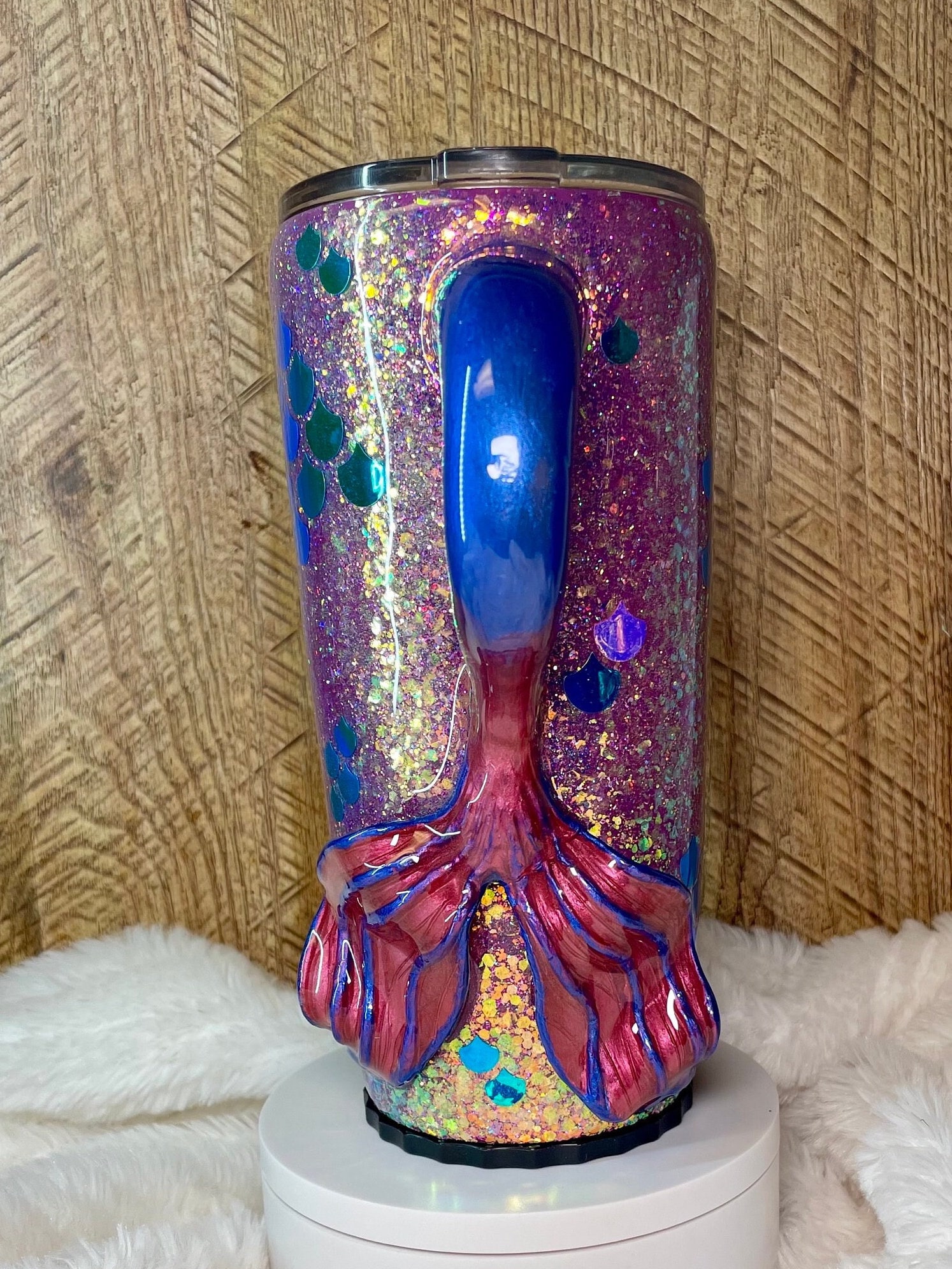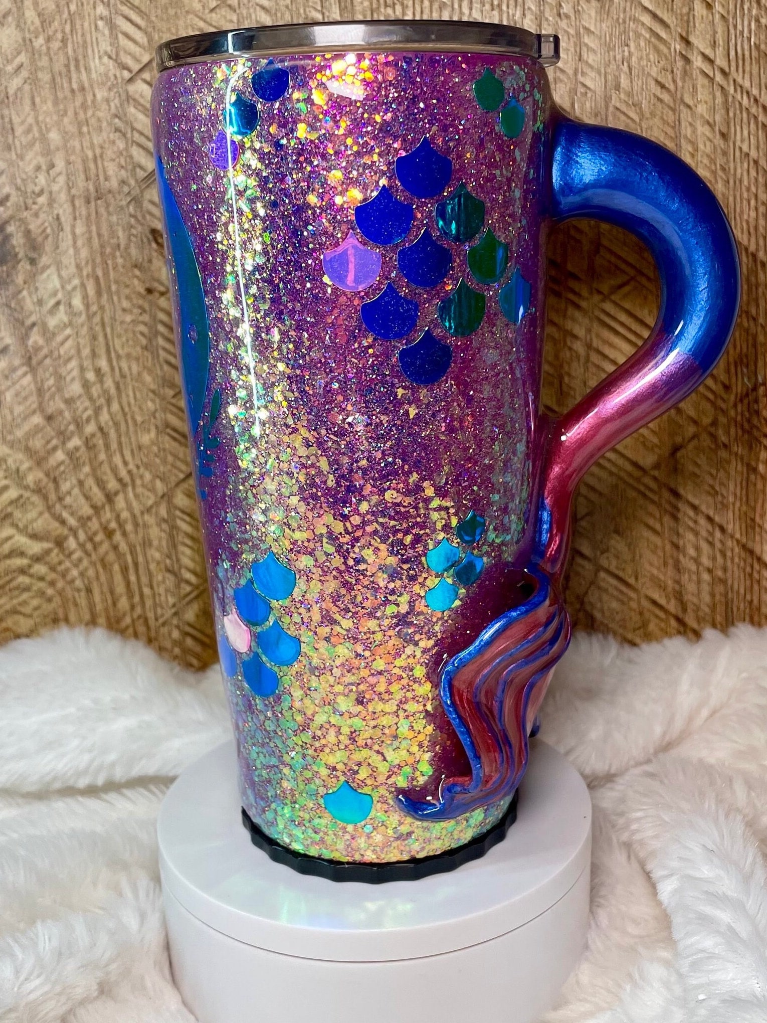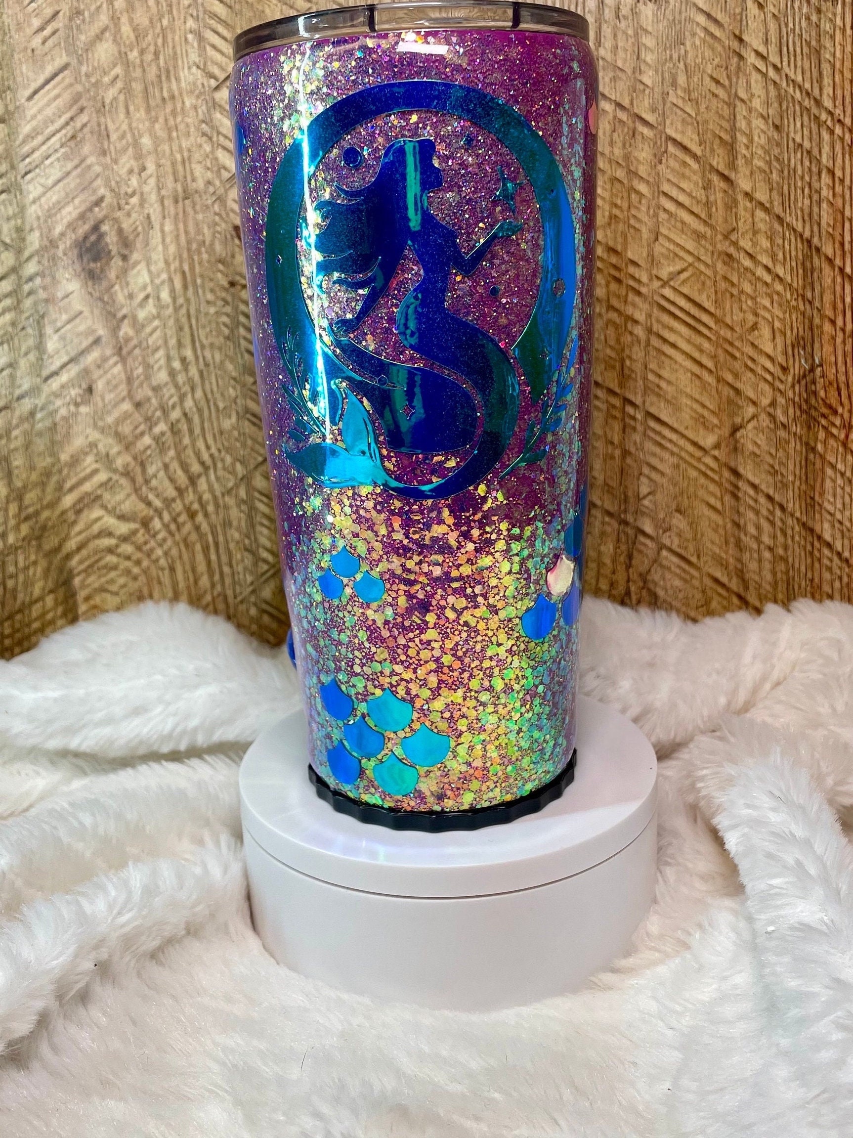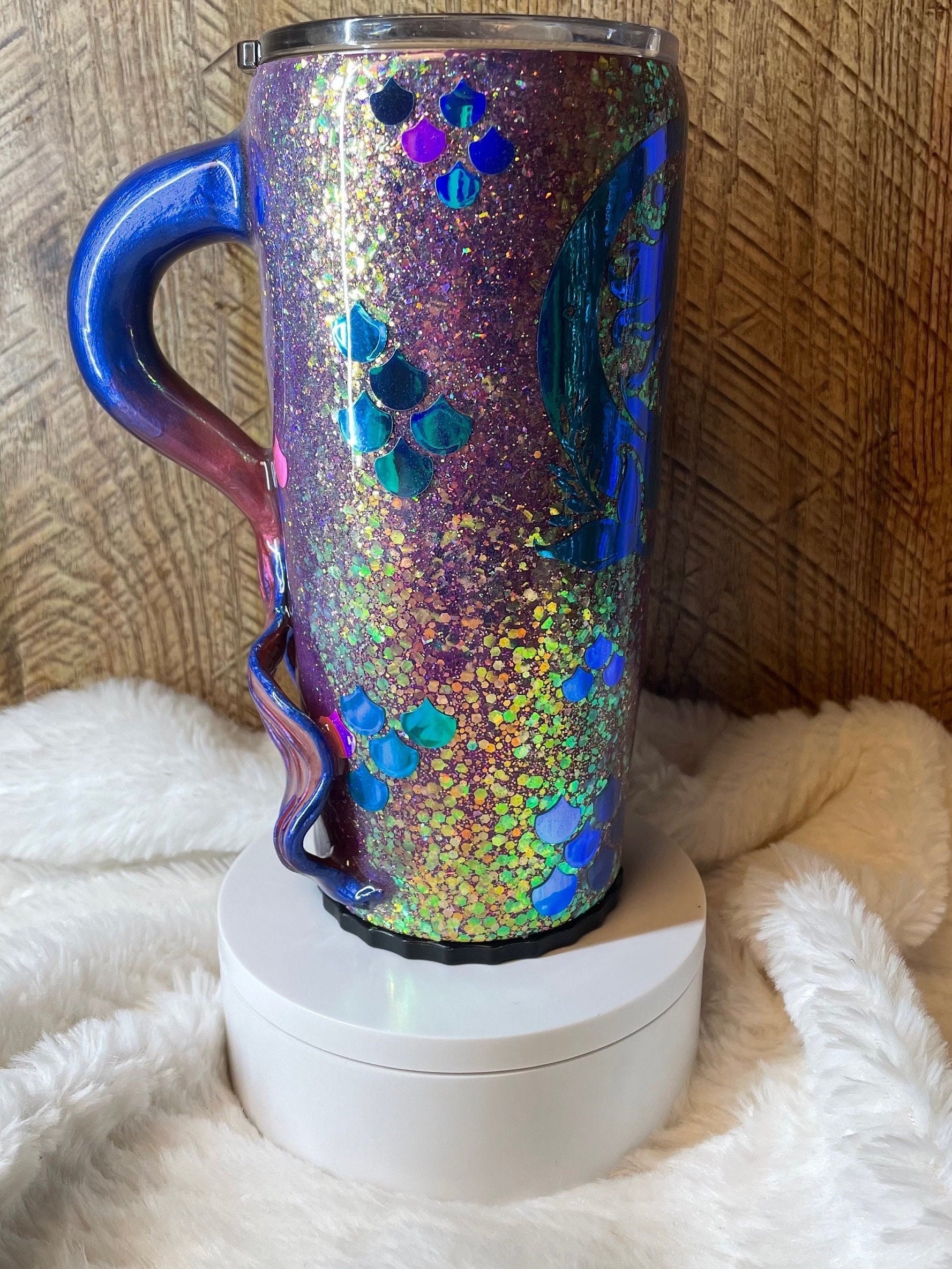 Hand sculpted mermaid tail handle tumbler. Tumbler is stainless steel double walled to keep drinks cold and hot for hours. Tumbler is crafted with color shift premium chunky glitter, the color changes with movement and light. The bottom of tumbler screws off, there’s a folding stainless straw and space can be used as a hiding spot for money or other small items.