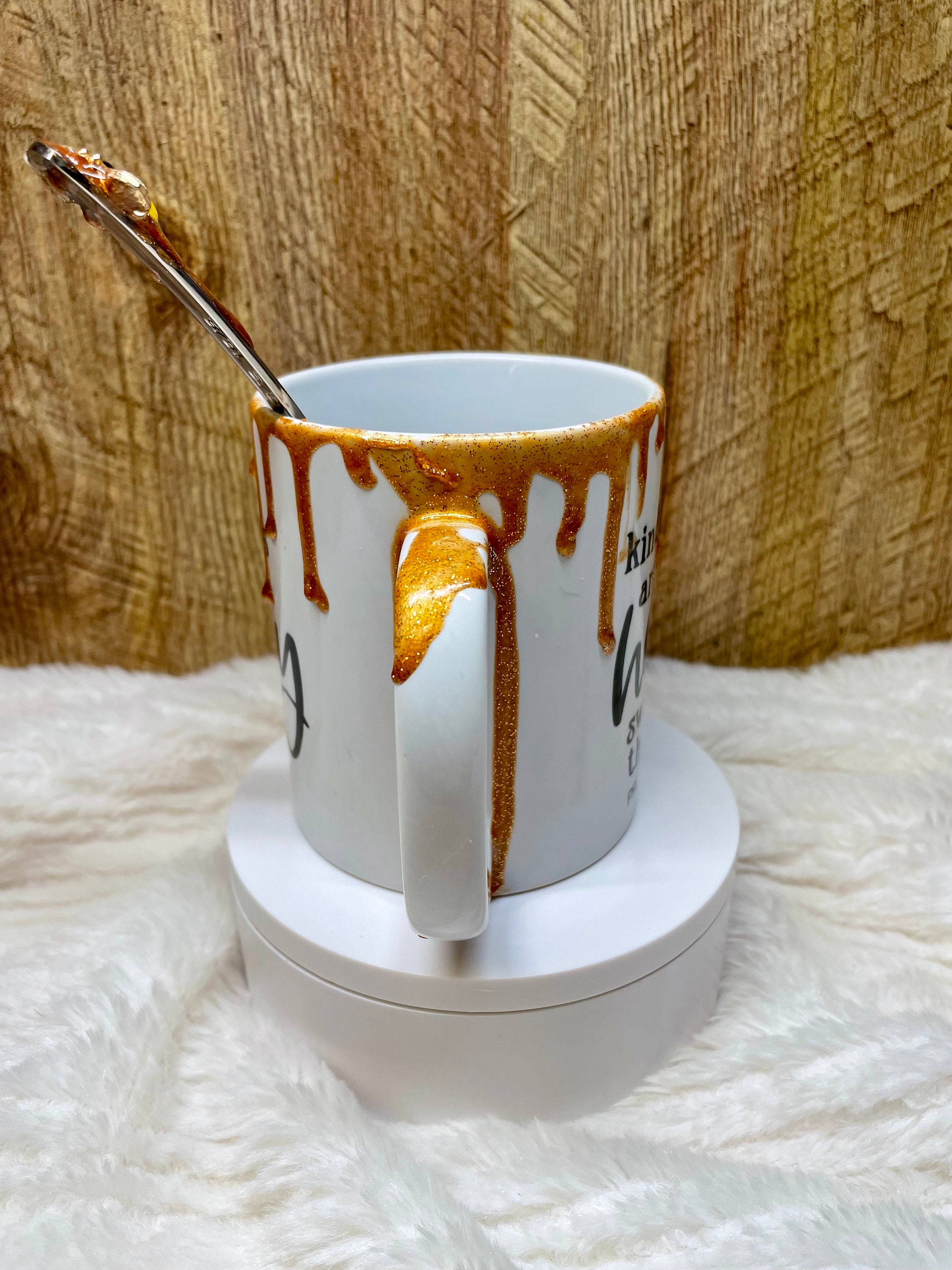 Proverbs 16:24 Ceramic coffee mug and spoon set with beautiful gold epoxy glitter epoxy drip. Spoon has adorable honey bee. Makes a beautiful gift set for display or everyday use made with food safe epoxy. Design is on both sides of mug for both left handed and right handed use. You may also choose to have design just on one side and a name or personalized quote on the other. Message me to make arrangements.