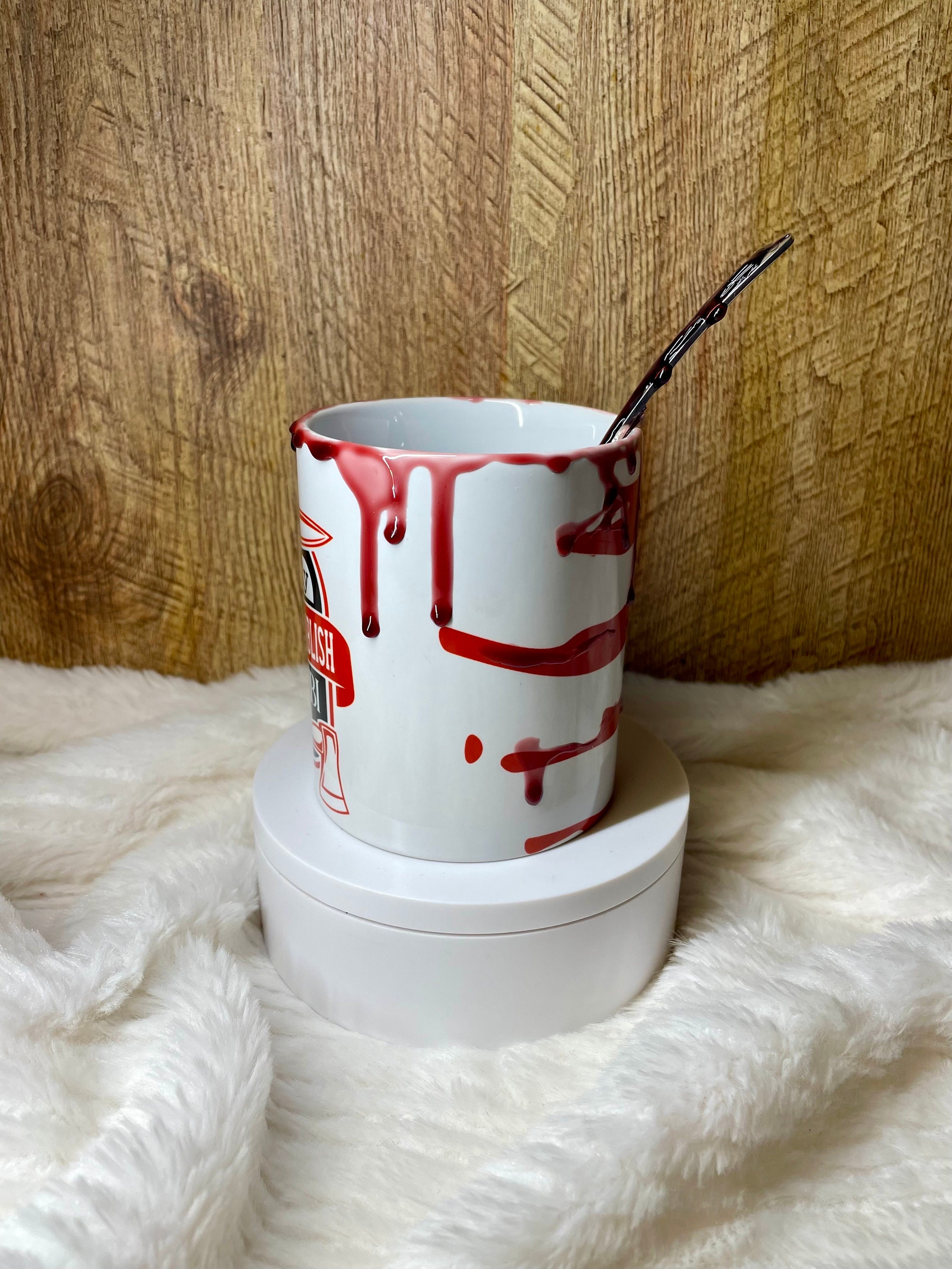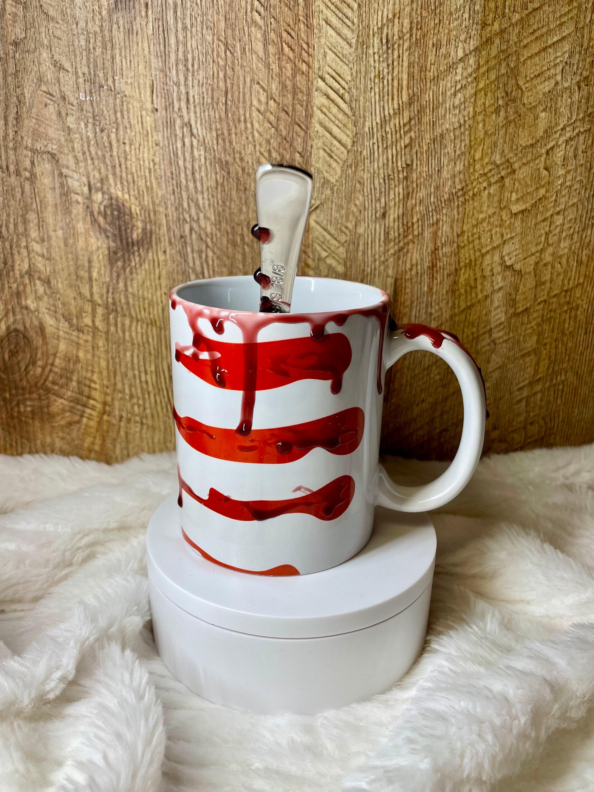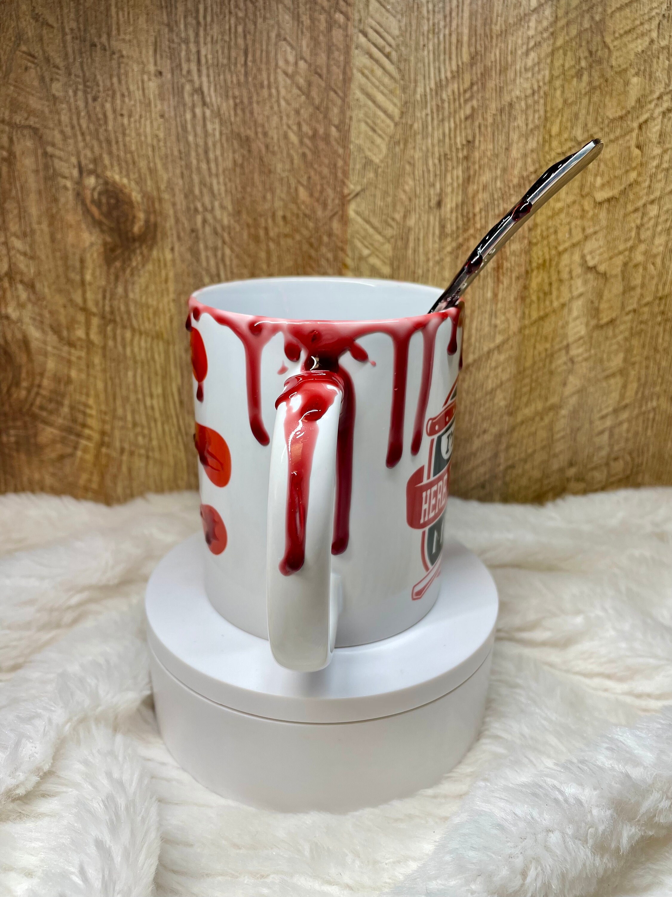 I’m only here to establish my alibi Ceramic coffee mug and spoon set with faux blood drip epoxy drip. Makes a fun unique gift set for display for the true crime lover or everyday use made with food safe epoxy. Can add a name or quote to the back in black. The mugs and spoons are made when ordered Ava each will be unique, no two alike but have the same spirit as the one pictured.