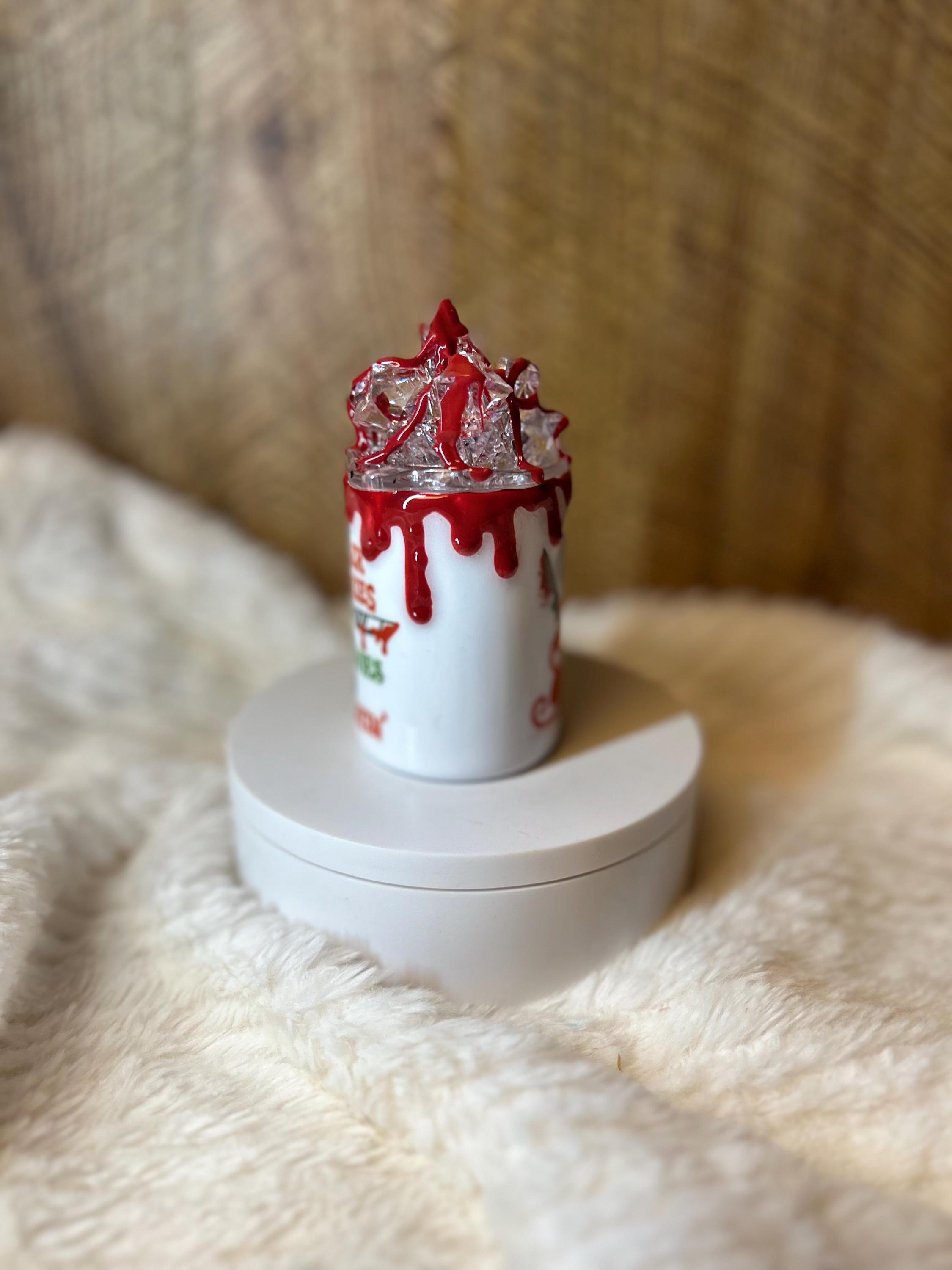 3 ounce Stainless steel double wall food safe epoxy tumbler. 3d blood drip on tumbler and faux ice topper. Perfect for Holiday parties and gift exchanges. sure to be a unique hand made gift. if you’re interested in multiples message me for discount.