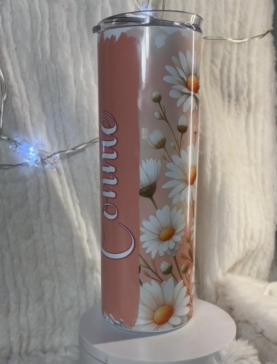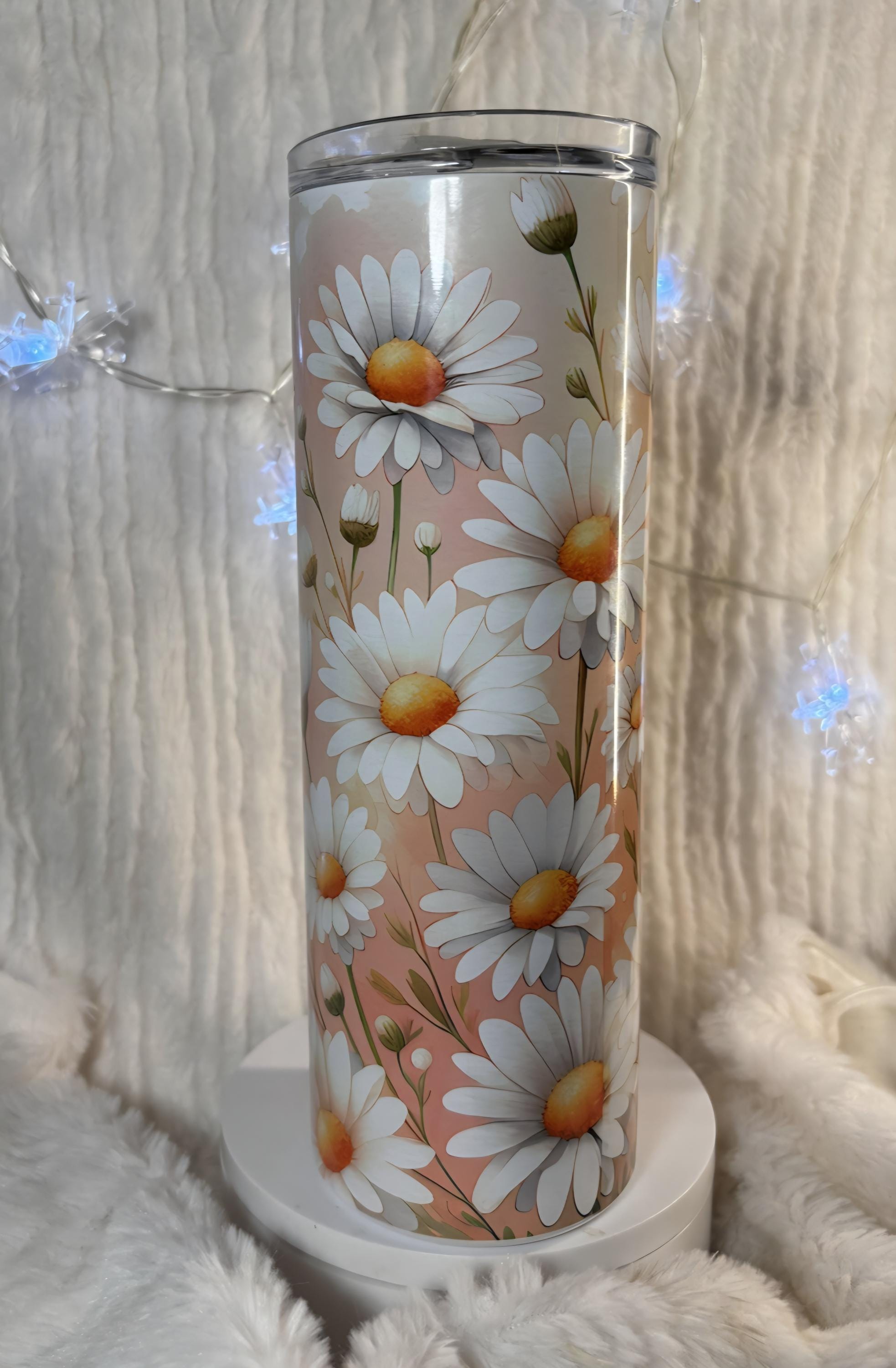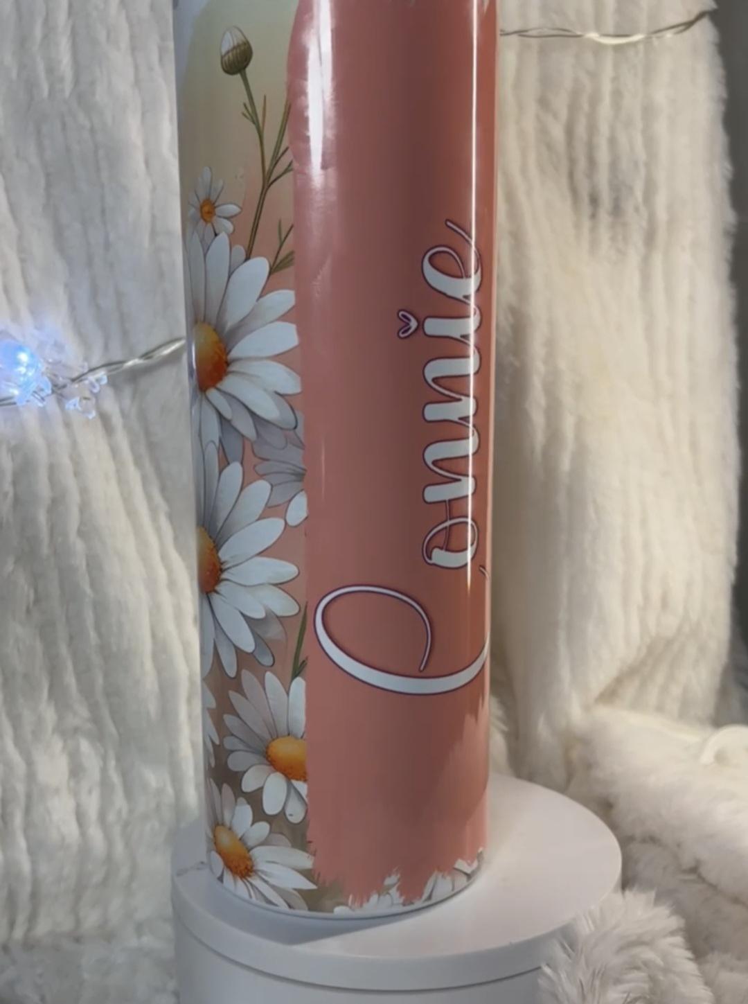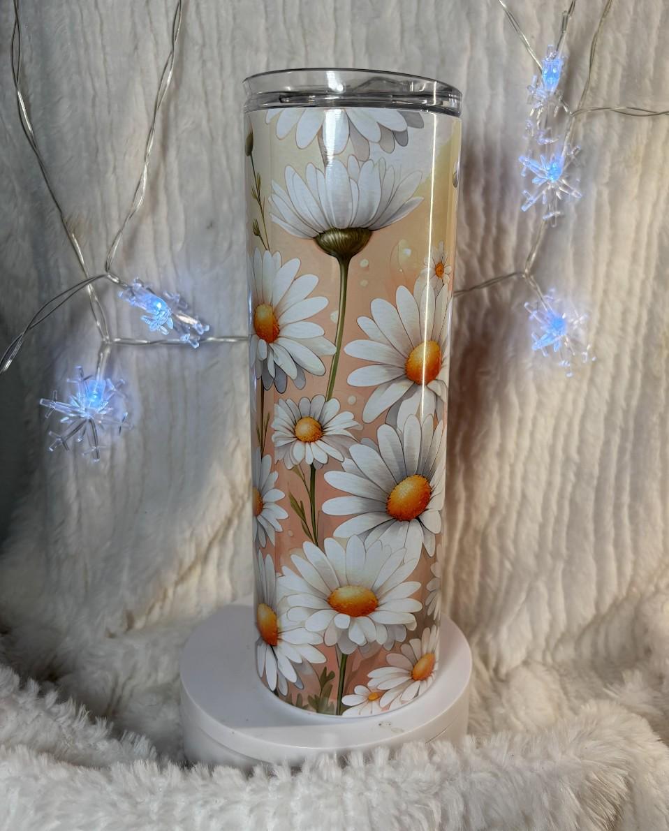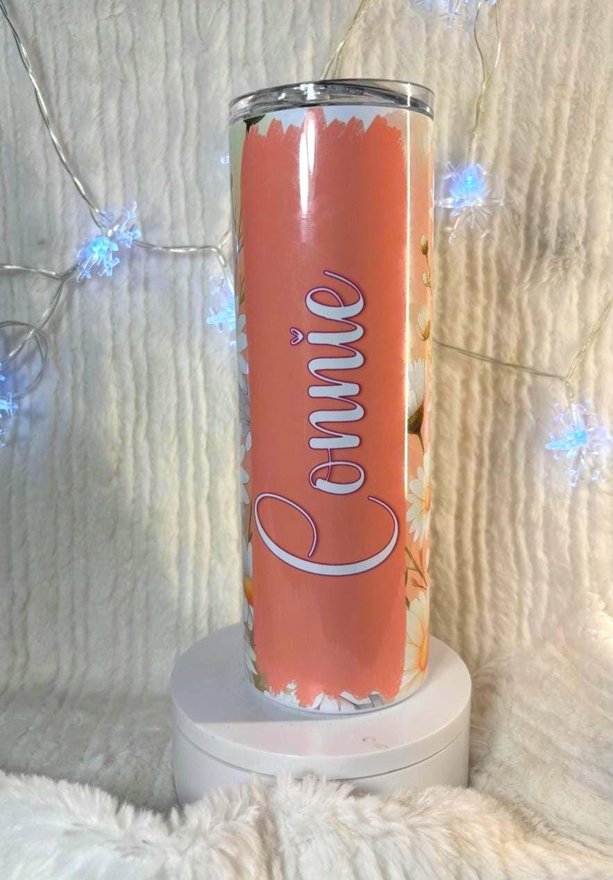 Absolutely gorgeous Daisy tumbler with beautiful shades of peachy orange white and yellow. 20 oz tumbler the colors are deep and vivid, stunning. Personalized with your name, your favorite saying or verse, a date, an event, family vacation, girls trip, bridesmade gift, any words or saying you want!! The tumbler is stainless steel, double walled and will keep your drinks hot or cold for hours!! makes a great gift!!