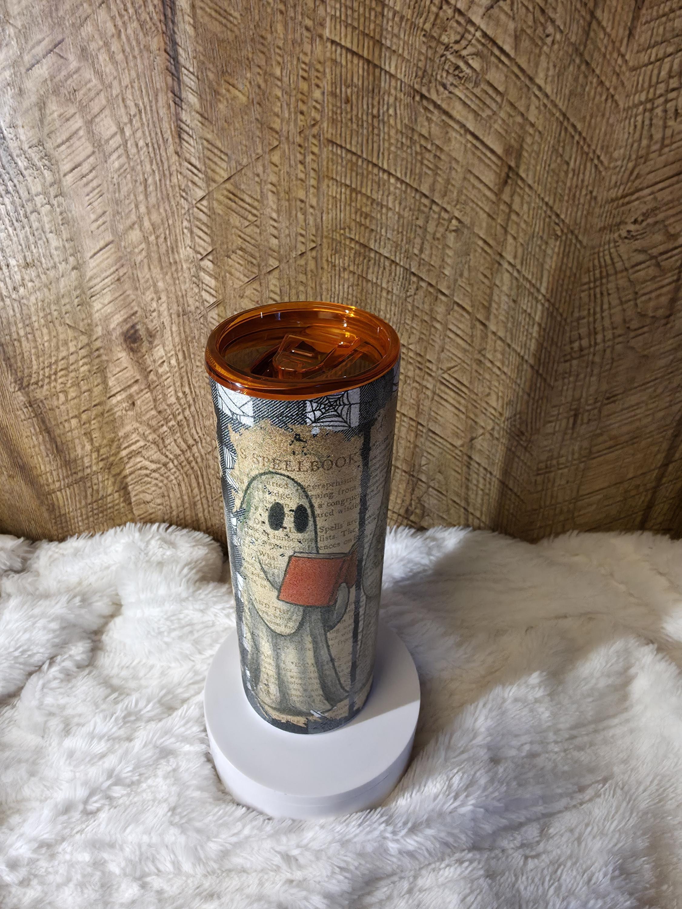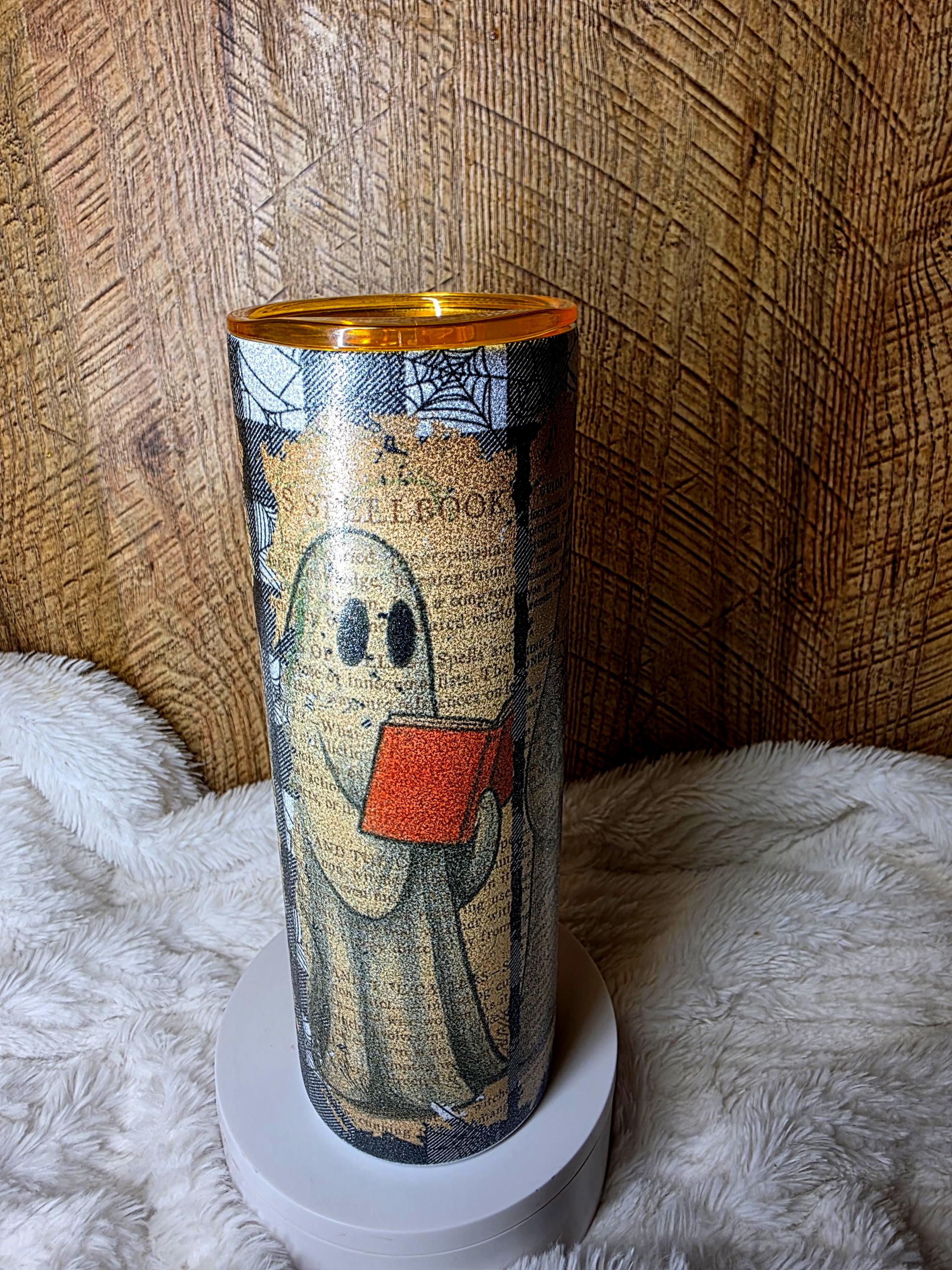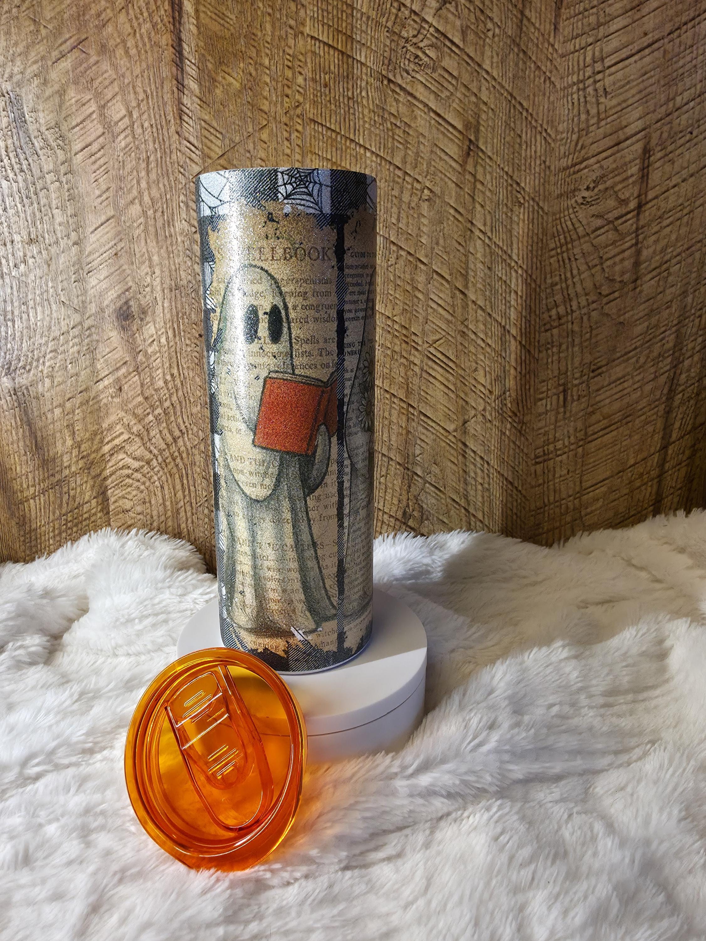 20oz Stainless Steel Glitter tumbler with coordinating orange lid and not so spooky bookish ghost design and matching orange acrylic sliding lid. Fun unique piece for Halloween or any time of the year. Makes a great gift. Please look at my other items and reach out with any questions, customizations, or discounts on bulk orders.