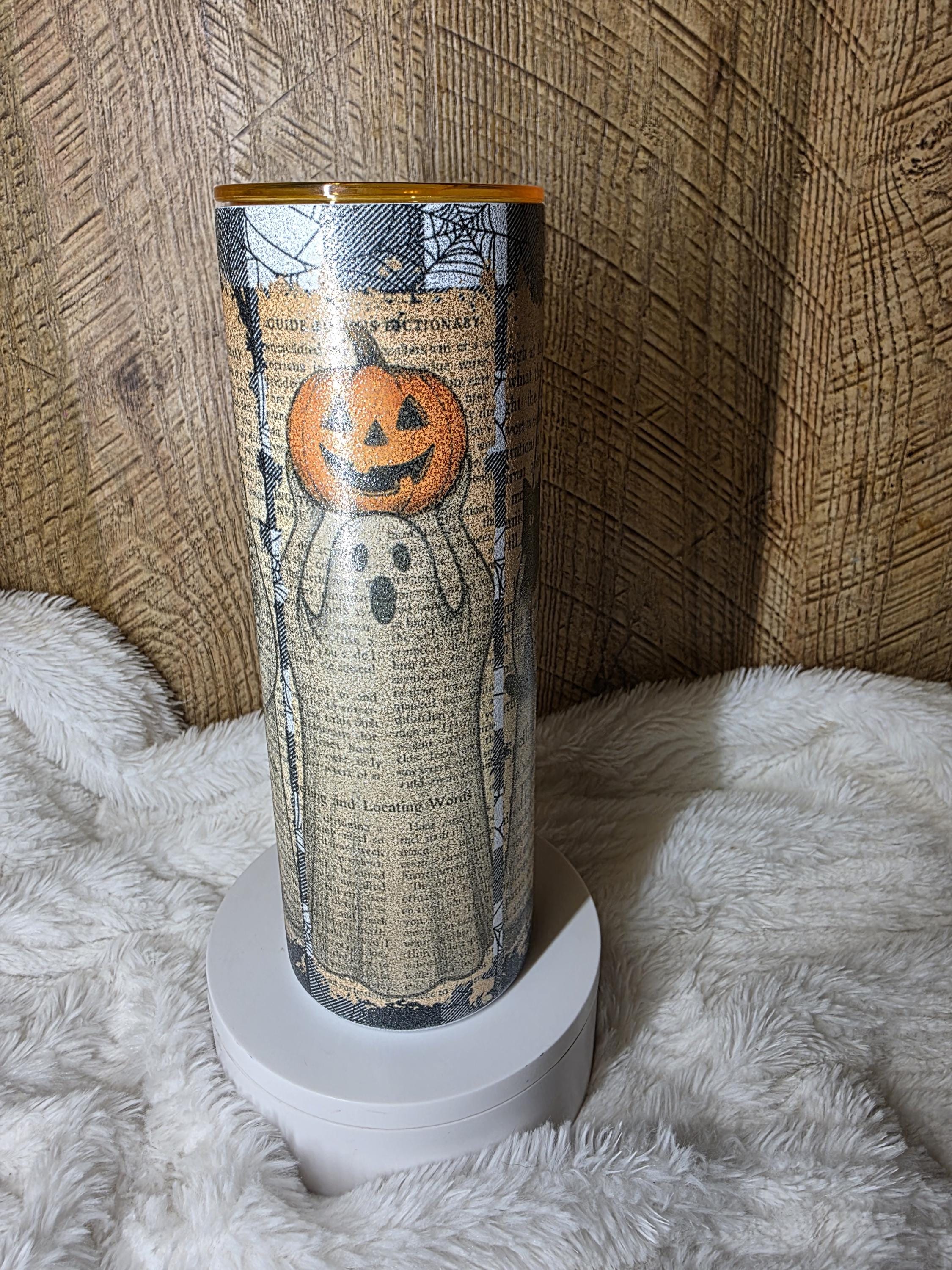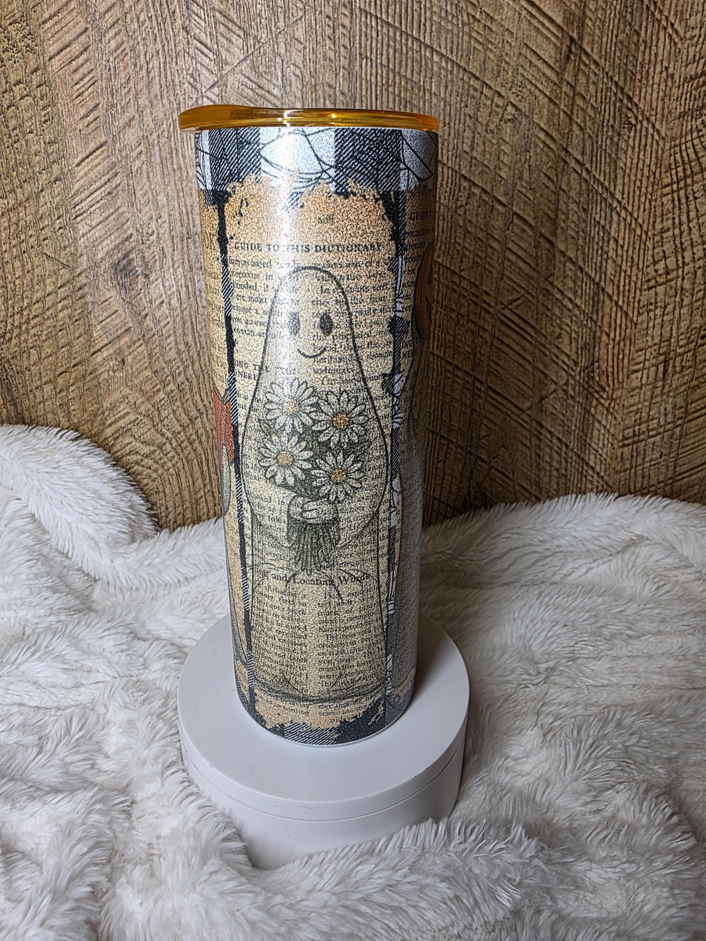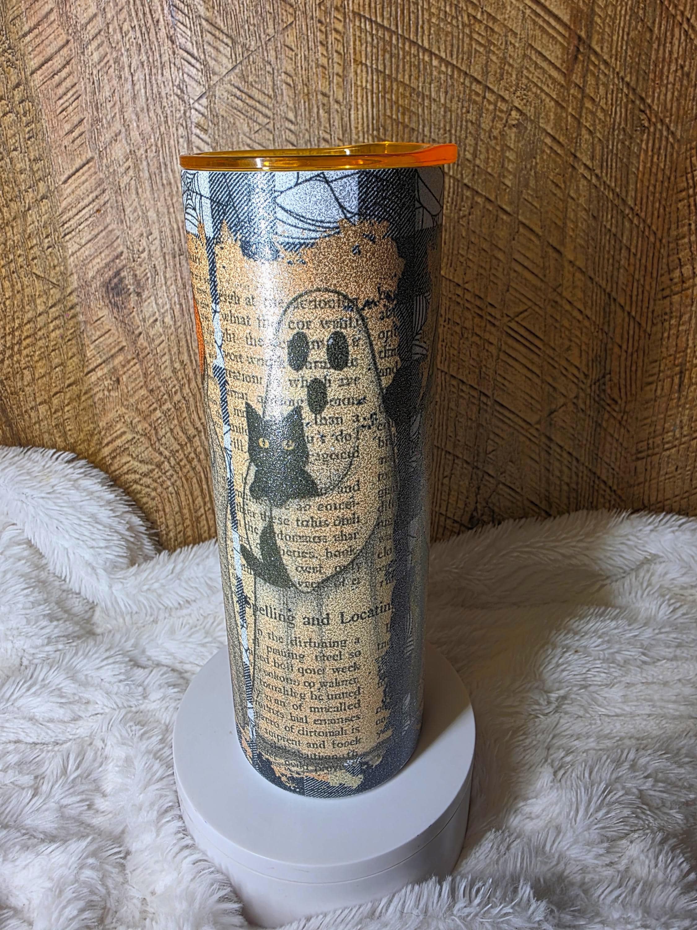 20oz Stainless Steel Glitter tumbler with coordinating orange lid and not so spooky bookish ghost design and matching orange acrylic sliding lid. Fun unique piece for Halloween or any time of the year. Makes a great gift. Please look at my other items and reach out with any questions, customizations, or discounts on bulk orders.