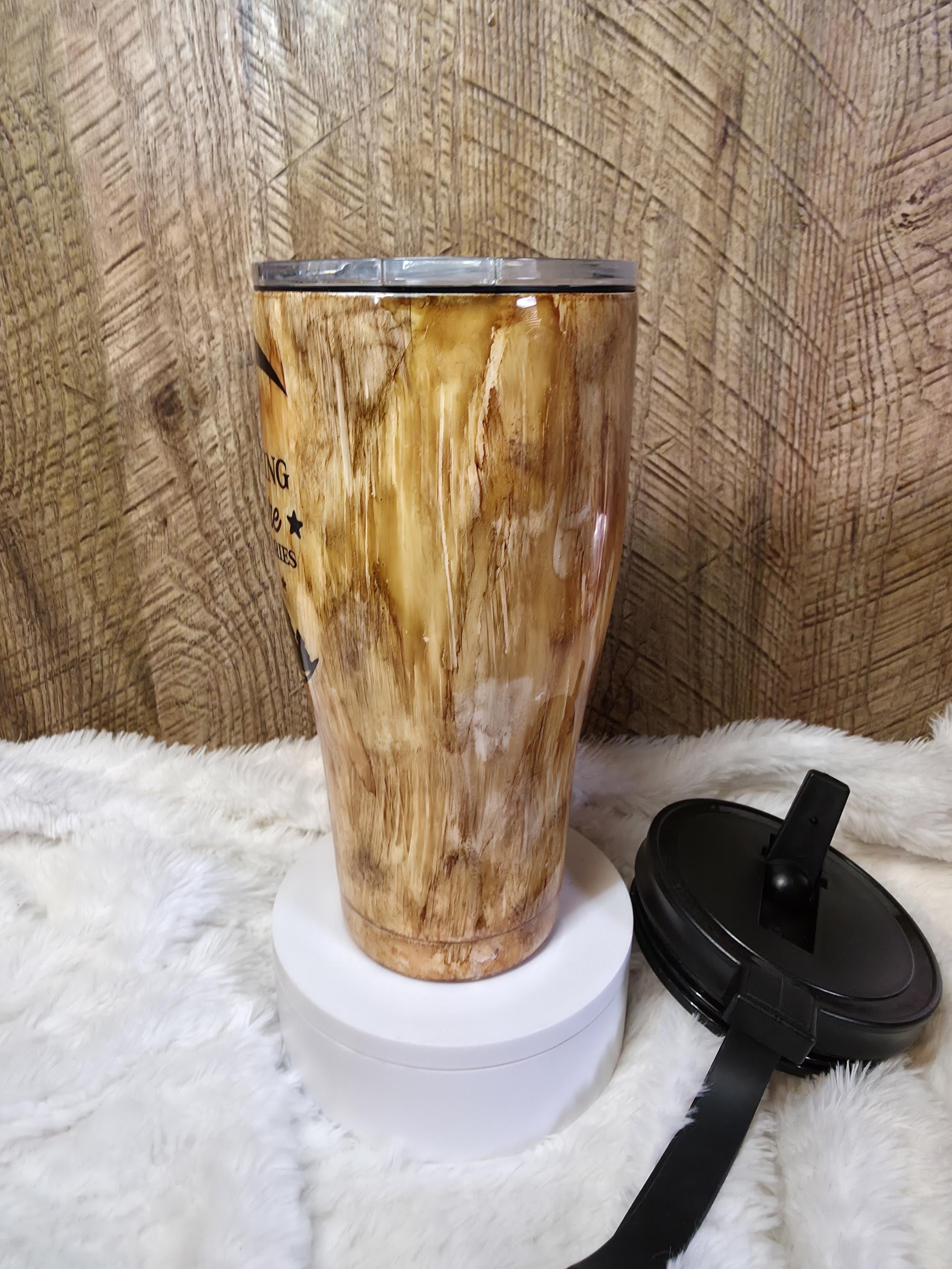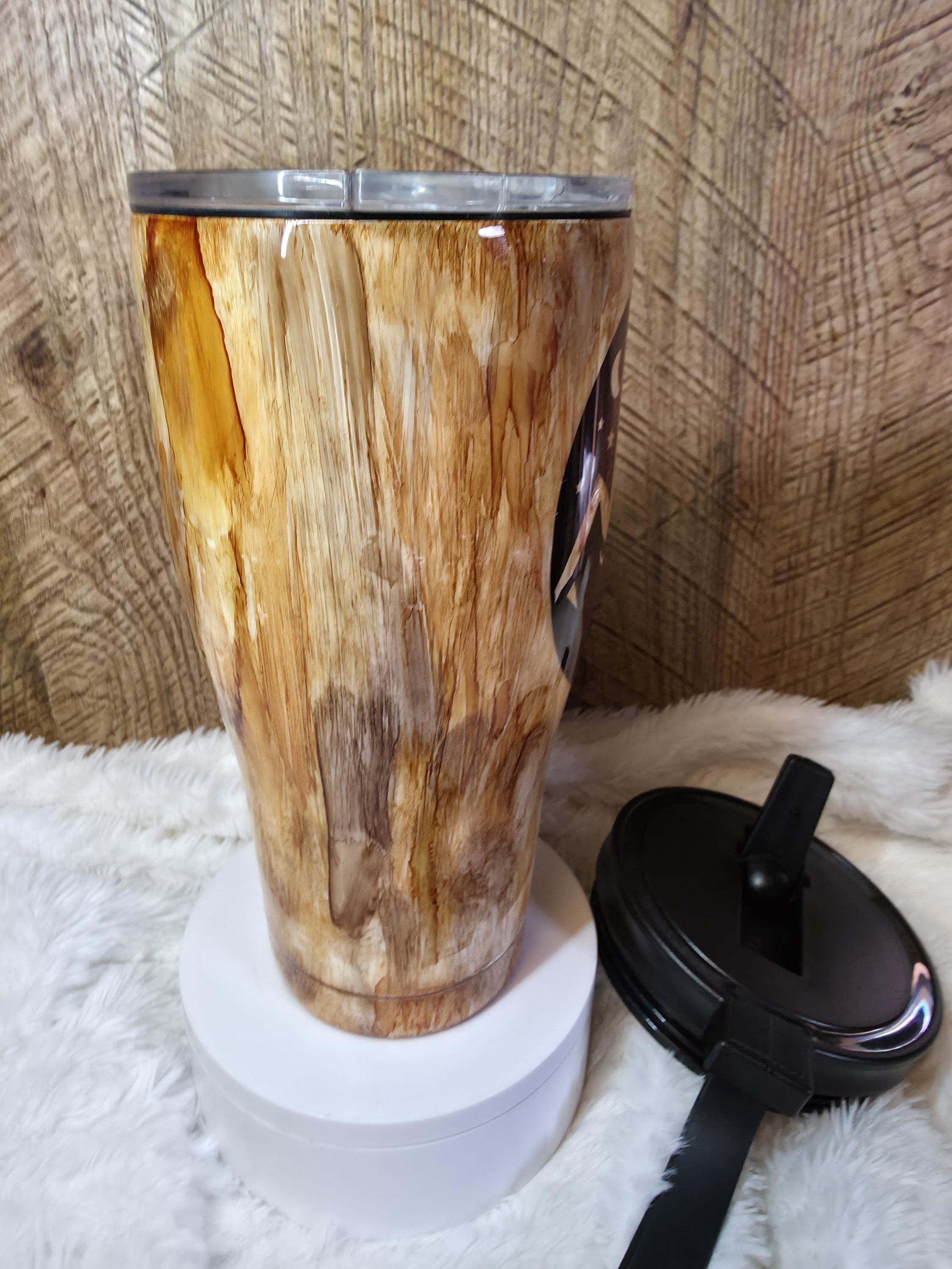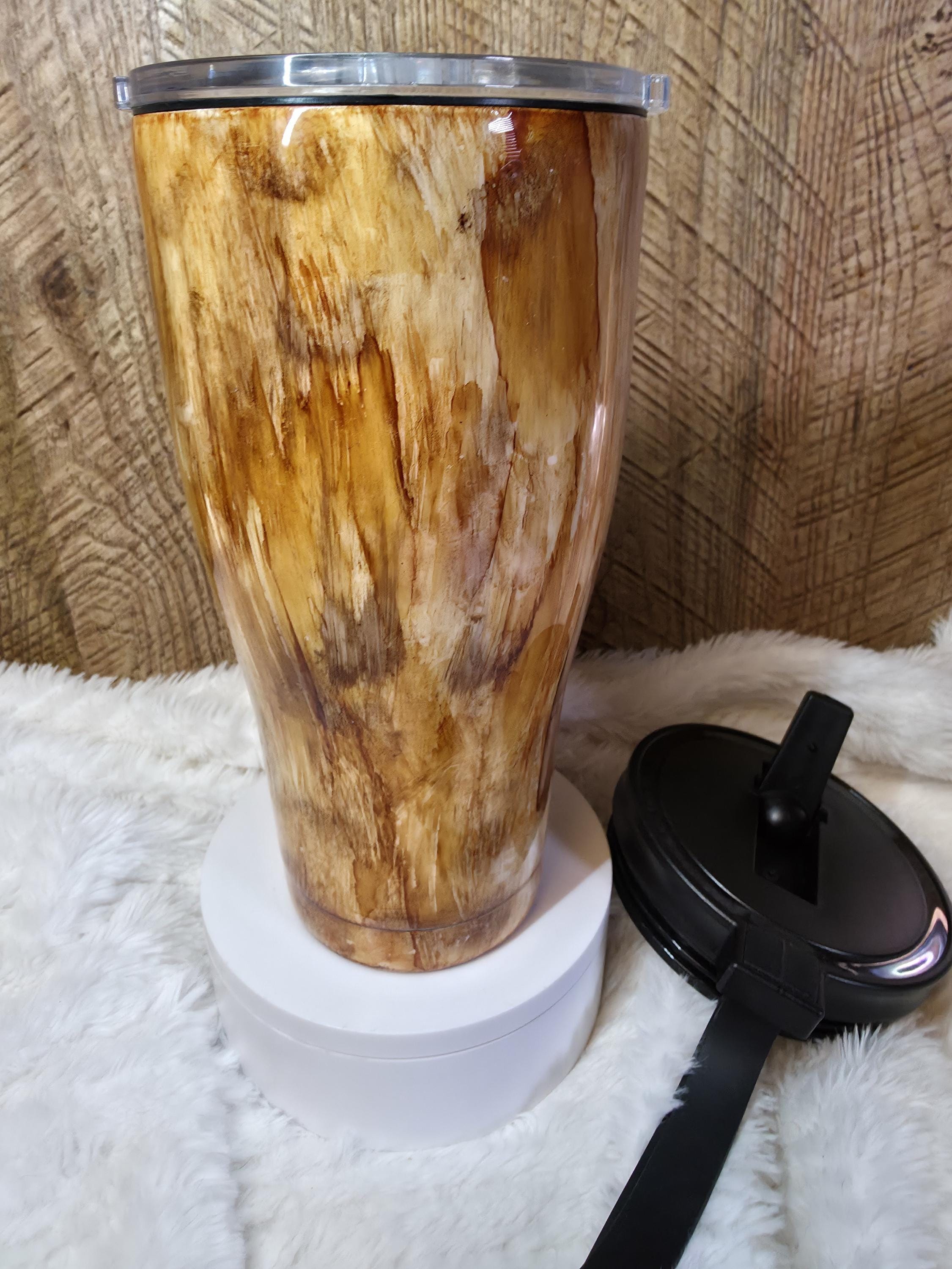 NOTE: Pictured tumbler is ready to ship! Gorgeous custom wood grain look hand painted with alcohol inks and coated with food safe epoxy for durability and glossy shine, perfect for outdoor enthusiasts.