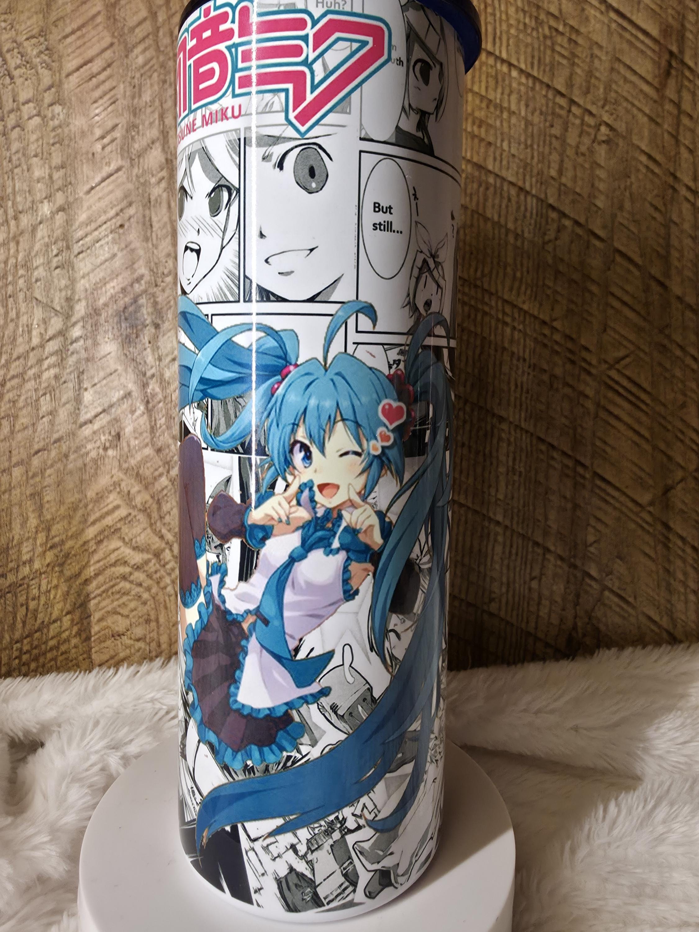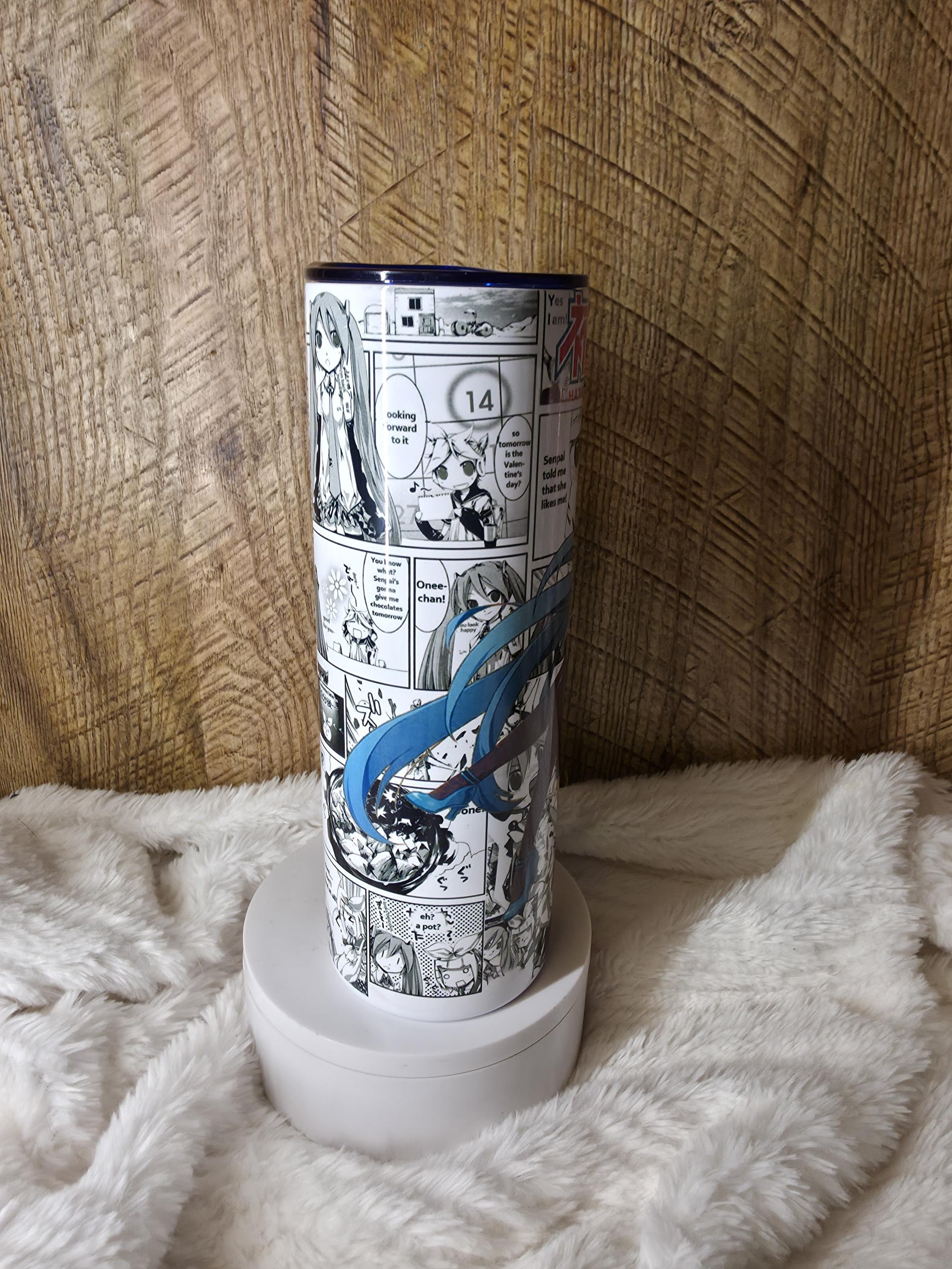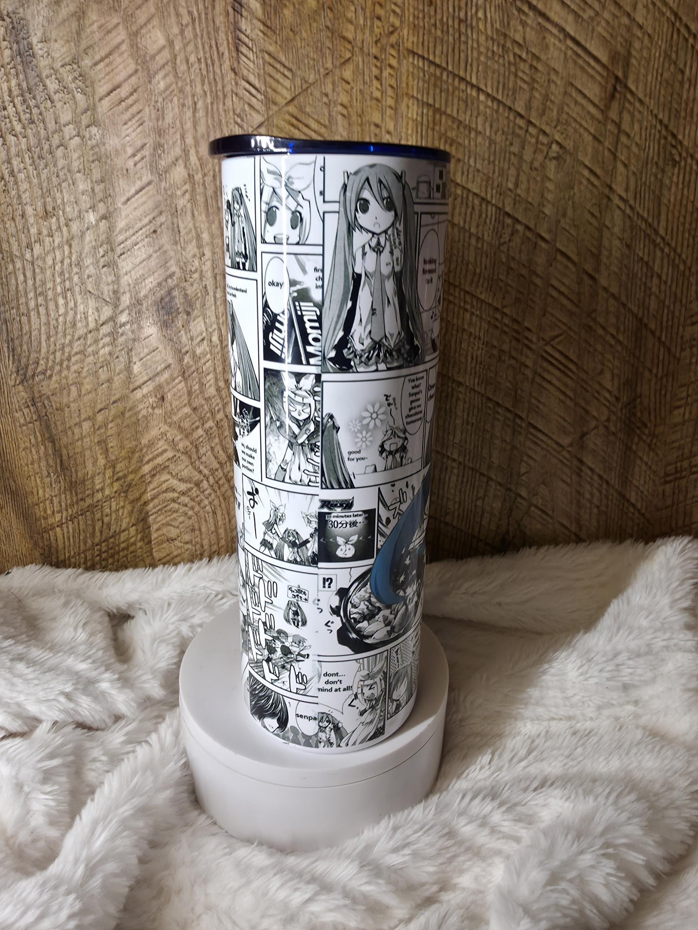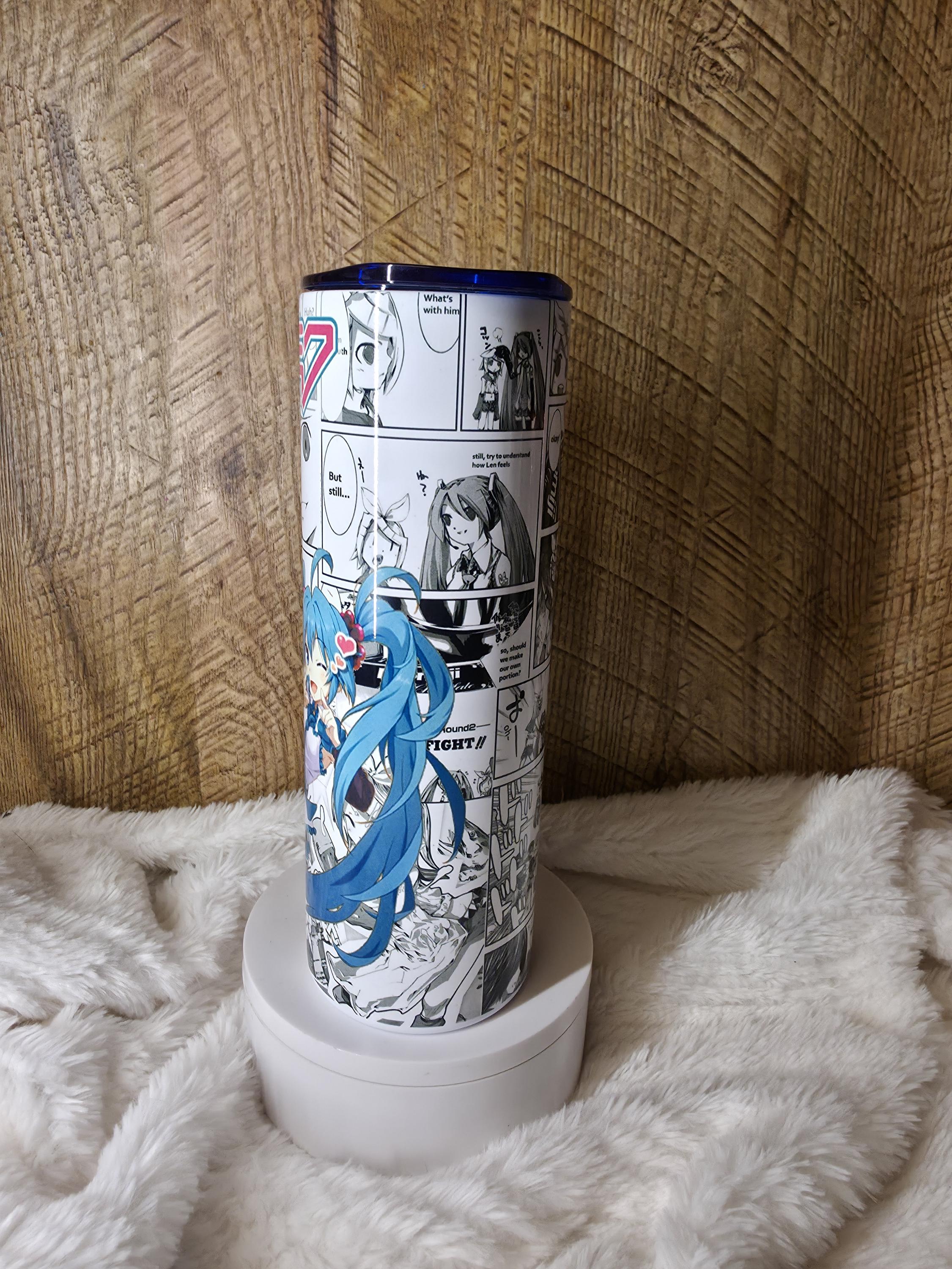 20oz cute Miku design double wall insulated tumbler, keeps drinks hot/cold for hours. Gorgeous blues on comic strip background. Choice of finish, Standard Glossy or Premium Glitter Epoxy coat finish, both are stunning with vivid colors.