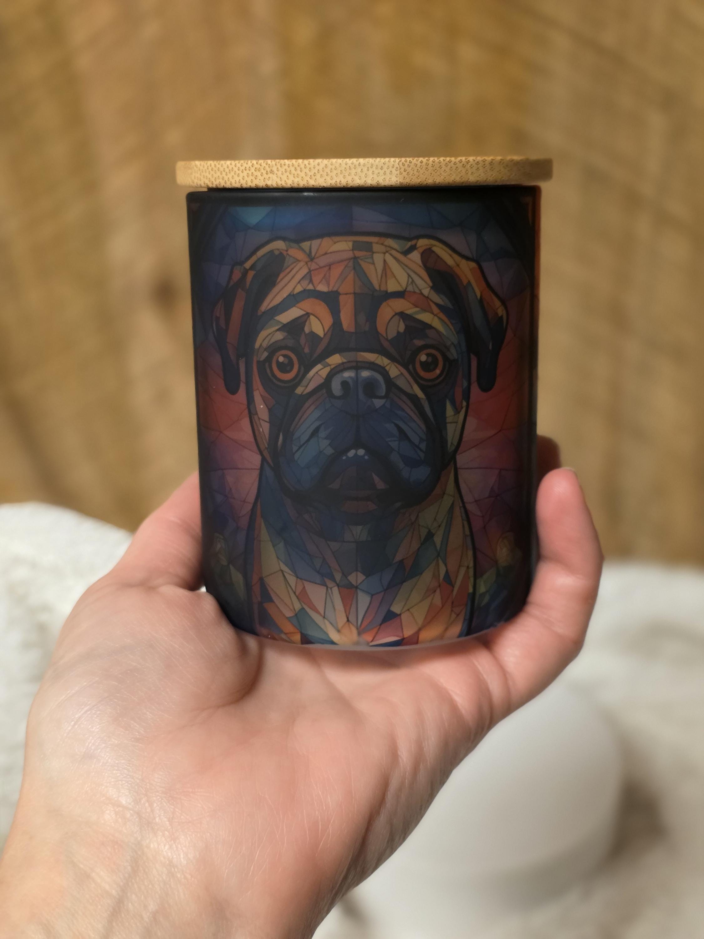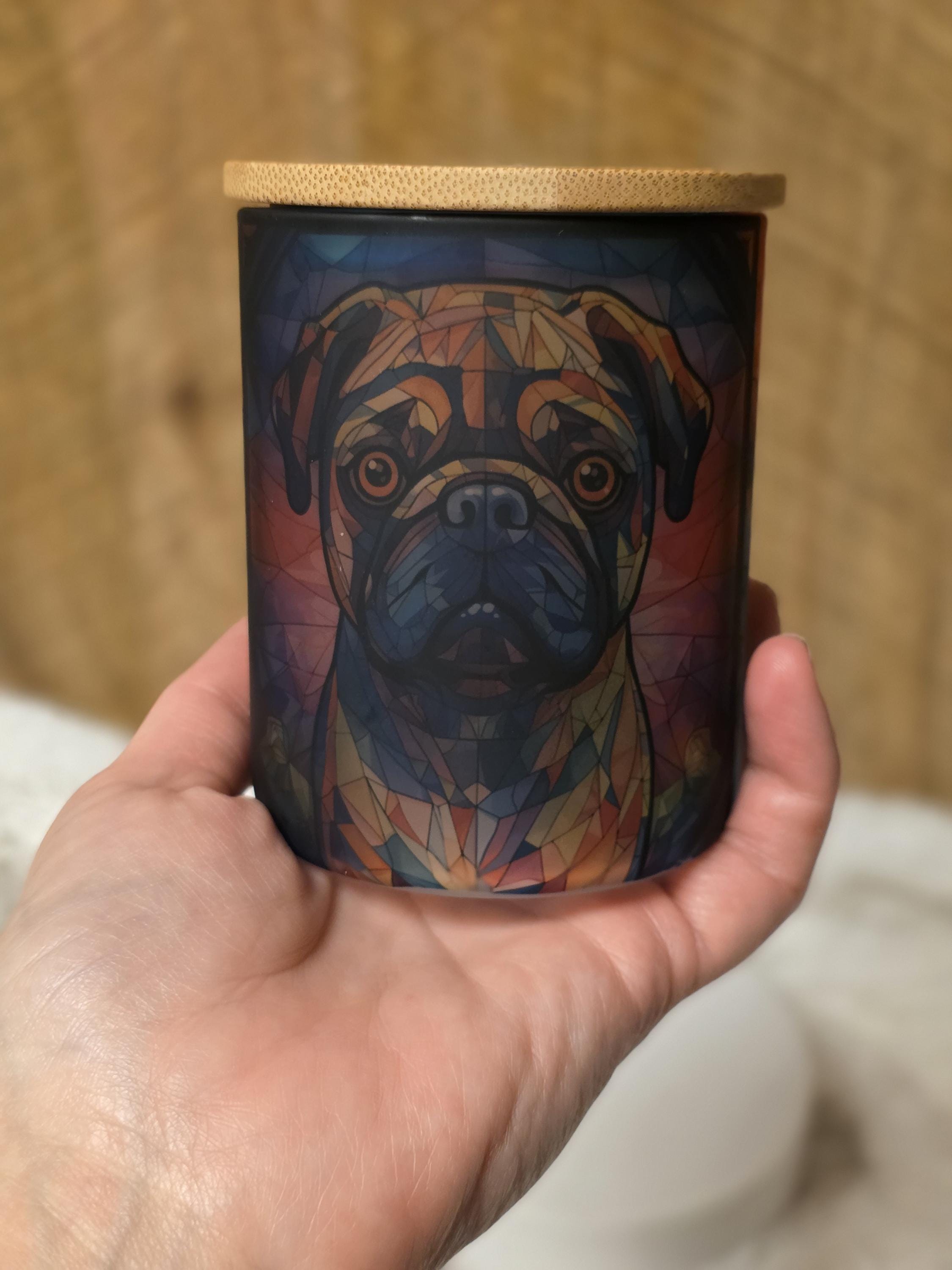 15oz Pug candle/ votive holder. Made of frosted glass with lid and flameless votive included. Gorgeous home accent, perfect as a gift.